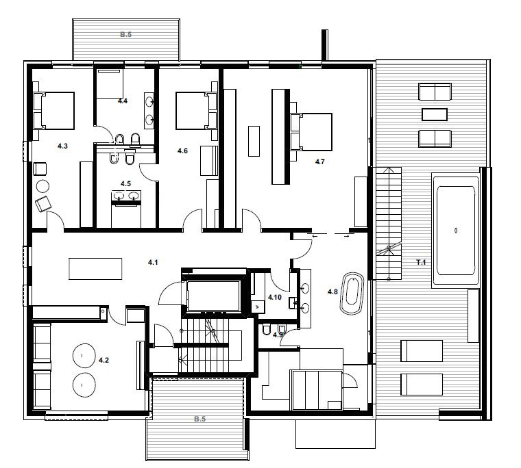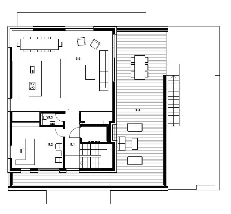 Razprostira se na dveh etažah, ki sta povezani z notranjim stopniščem ter dvigalom. Velik dnevni prostor se preko velikih drsnih vrat na široko odpira v teraso, ki je preko zunanjega stopnišča povezana s teraso v nižji etaži. Tu je velik bazen in prostor za poležavanje na soncu. Spodnja terasa z bazenom je preko drsnih vrat povezana s savno, jacuzzijem in glavno spalnico, kar bo lastniku prišlo prav ob hladnejših dnevih.