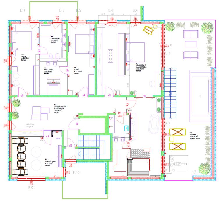 V etaži nižje je glavna spalnica z veliko garderobo in kopalnico, z izhodom na teraso s plavalnim bazenom, domači SPA s savno in jacuzzijem, 2 dodatni sobi z lastnima kopalnicama (izhod na balkon) ter kino dvorana (izhod na ložo).