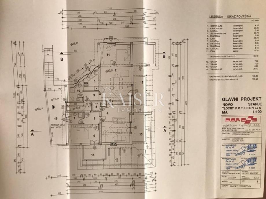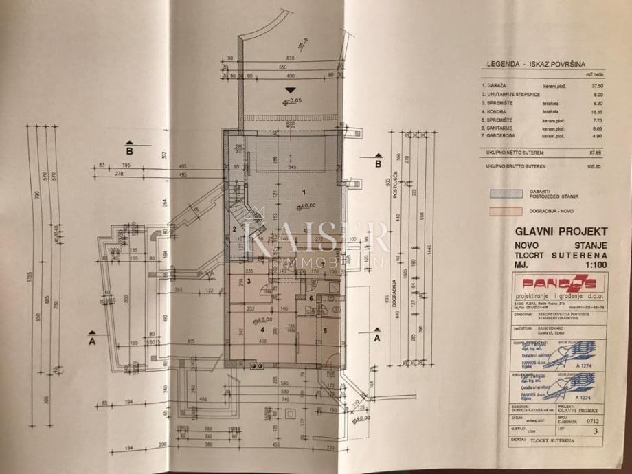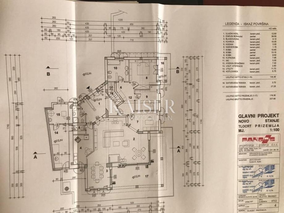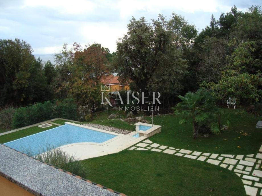Kaiser Immobilien predstavlja kvalitetno zgrajeno vilo na zelo atraktivni lokaciji v Lovranu, 250 metrov od plaže in 350 metrov od starega mestnega jedra. Vila je sestavljena iz kleti (87 m2) z garažo za 2 avtomobila, WC-jem, kopalnico in prostorom za vinsko klet, konobo s kaminom in savno. Notranje ali zunanje stopnišče nas vodi v pritličje, kjer se nahaja veliko stanovanje 145 m2 z ogromno dnevno sobo, kuhinjo, jedilnico, 3 spalnicami, 2 kopalnicama. Na voljo je tudi pralnica, kurilnica ter izhod na veliko teraso in prostoren vrt. V mansardi, ki je dostopna po zunanjem stopnišču, sta 2 ločeni stanovanji s kuhinjo, jedilnico, dnevno sobo, spalnico, kopalnico in balkonom (vsak po 50 m2). Lastniki vile ta dva apartmaja oddajajo poleti. Vila ima velik vrt 1371 m2 z neskončnim bazenom, žarom, velikimi hrastovimi drevesi in drugimi sredozemskimi rastlinami. Okoli hiše je na voljo več (10+) parkirnih mest.
