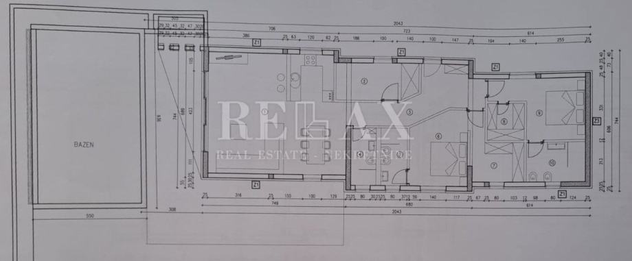 Stanovanje obsega prostorno dnevno sobo, kuhinjo in jedilnico z izhodom na čudovito teraso velikosti 40 m², ki je idealna za sprostitev in druženje. Na terasi se nahaja tudi lasten bazen.