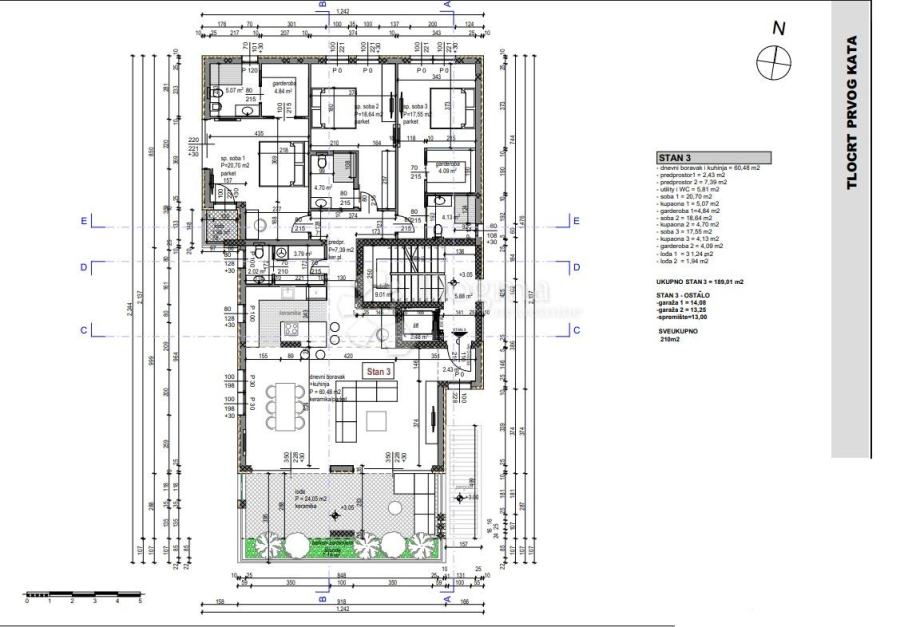 Dnevna soba ima direkten izhod na pokrito teraso 31,24 m², ki je obrnjena proti jugu in ima pogled na morje in mesto.