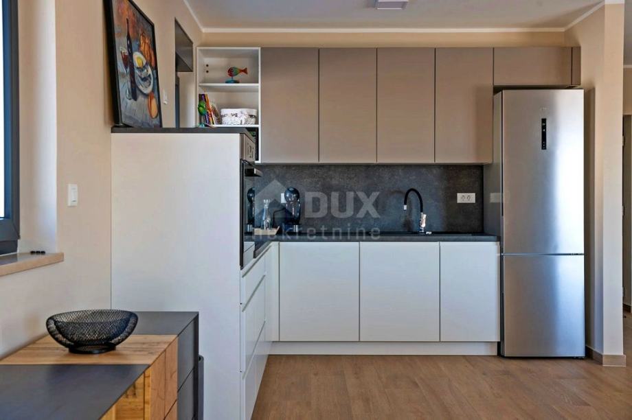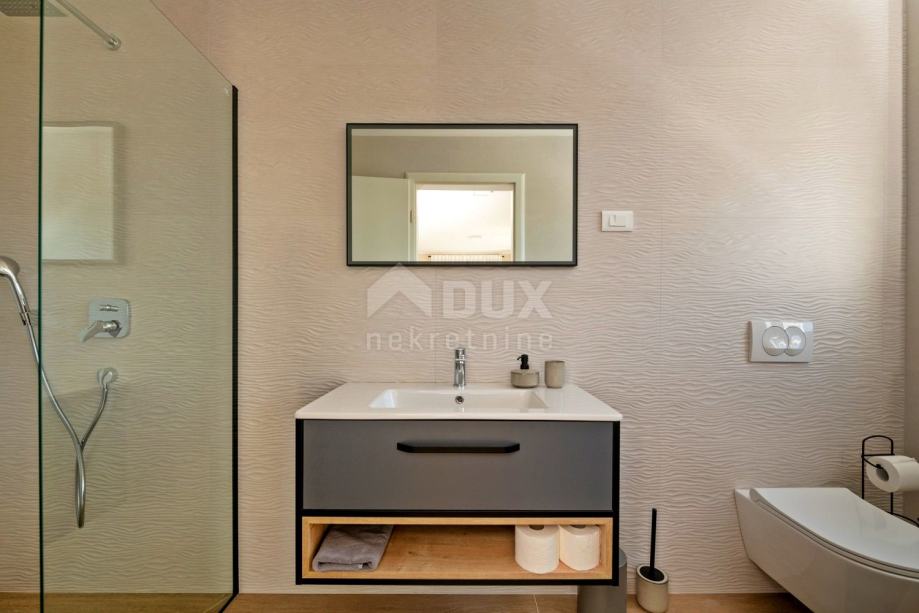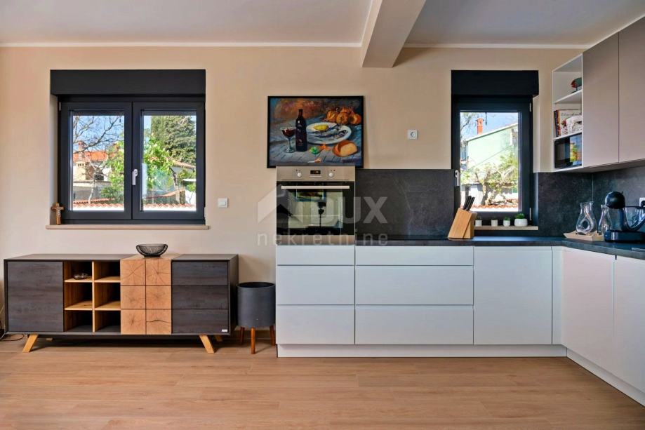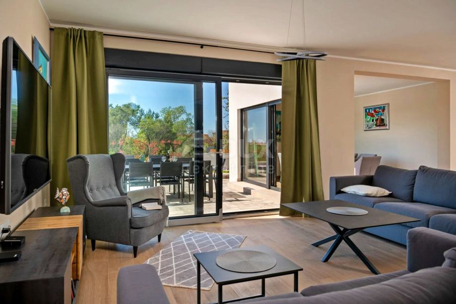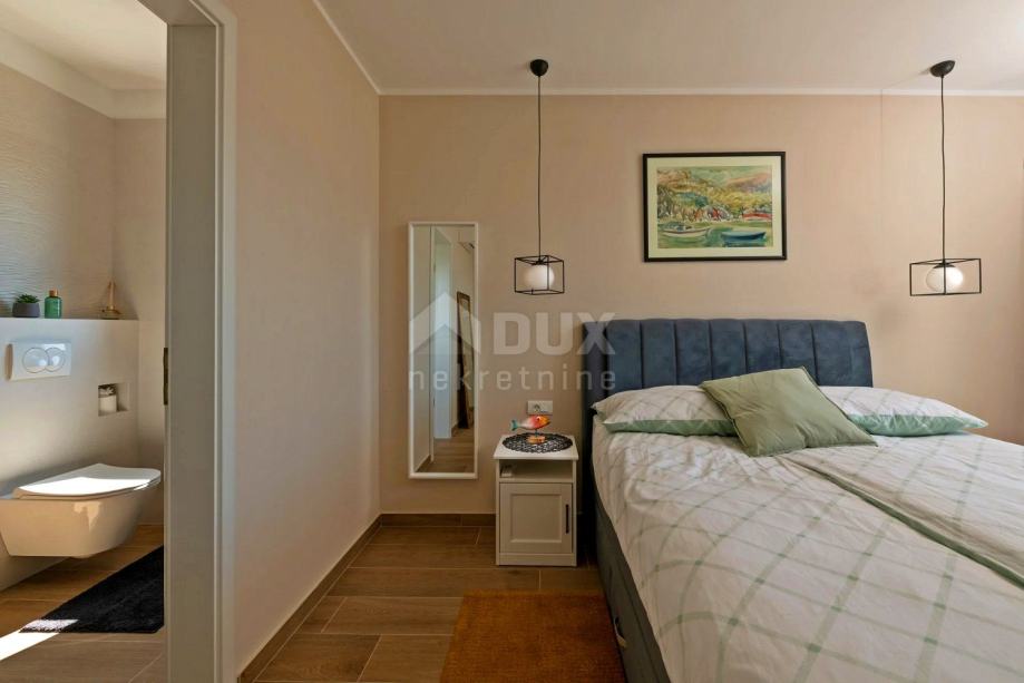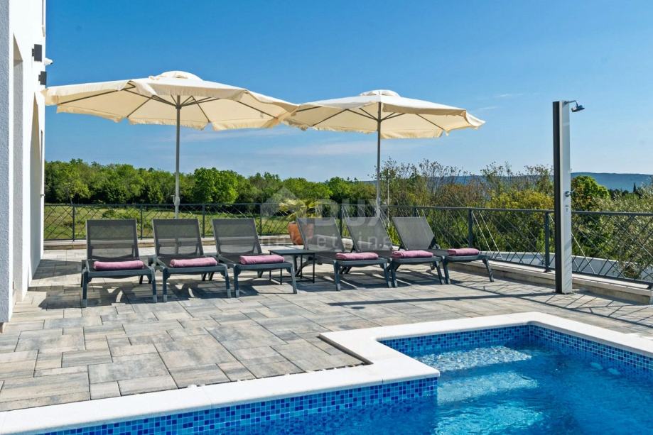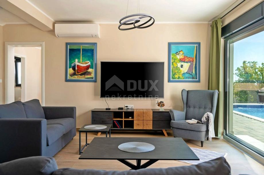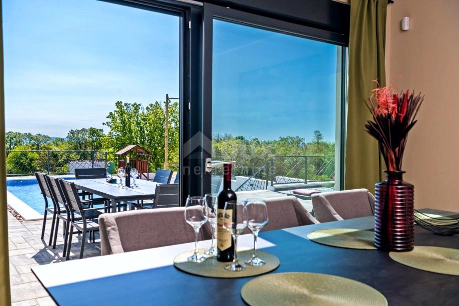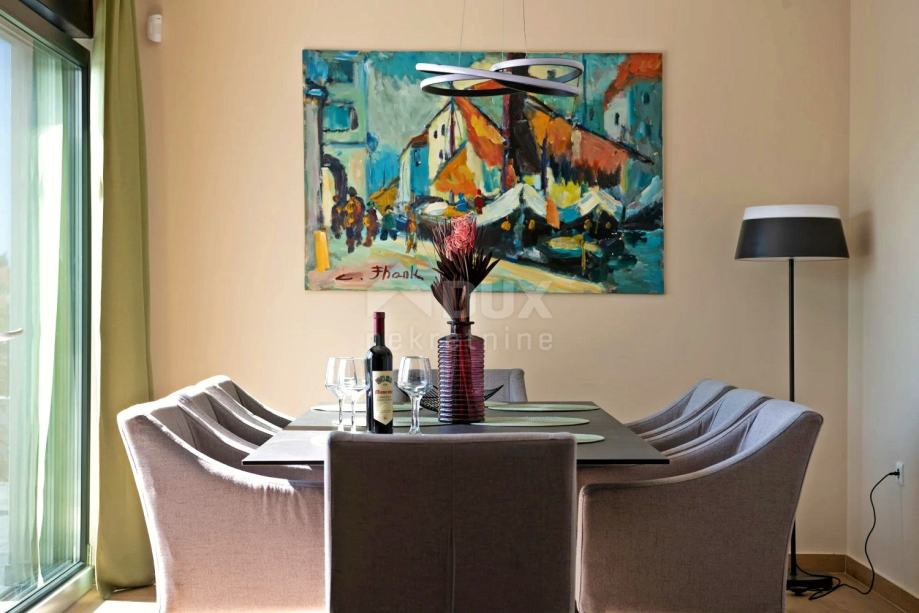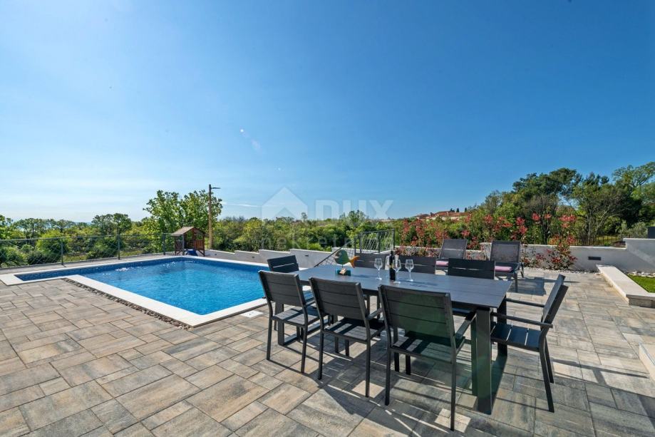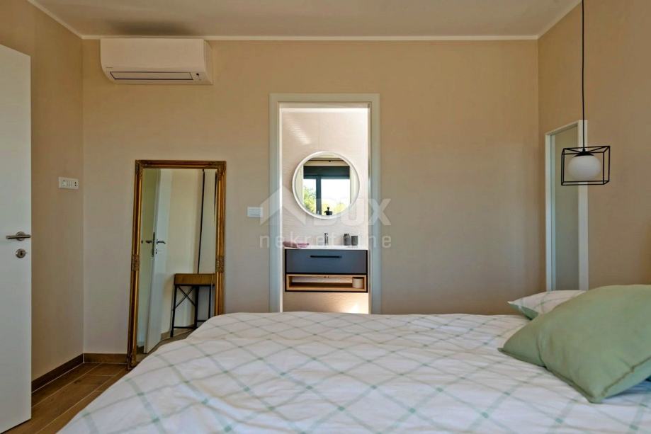 Marčana je občina na jugovzhodu istrskega polotoka. Nahaja se približno 12 km severovzhodno od Pulja, največjega mesta v Istri. Znana je kot destinacija za morje, počitnice, vino in oljčno olje. To je kulturno bogato naselje s kristalno čistim morjem in skoraj neresnično pokrajino, sestavljeno iz čudovitih zalivov in zelenih polotokov. Njenih 36 kilometrov obale je najmanj urbanizirano obalno območje v Istri. Marčana in njena rodovitna zelena polja, s položnimi griči, ki se spuščajo v skrite skalnate zalive in osamljene vasice in mesta so neodkrito bogastvo vzhodne obale Istre. Na obrobju enega od naselij v občini Marčana je naprodaj novogradnja z bazenom v bližini morja. Poleg priročne lokacije nepremičnino odlikuje privlačen, a preprost dizajn, ki se odlično zlije z okoliško pokrajino. Popolnoma uravnotežena notranjost in zunanjost prepričata s svojo praktičnostjo in funkcionalnostjo. Bivalni del je razporejen v dveh etažah; pritličje in prvo nadstropje. Pritličje sestavlja bivalni prostor odprtega tipa, ki združuje dnevno sobo, jedilnico in kuhinjo z izhodom na teraso. Tlorisno površino dopolnjujejo spalnica z lastno kopalnico, WC za goste, shramba, hodnik in stopnišče. Prvo nadstropje sestavljajo tri spalnice z lastnimi kopalnicami in teraso s pogledom na morje. Ogrevanje/hlajenje hiše je izvedeno s klimatskimi napravami, v pritličju pa je nameščeno talno ogrevanje. Ob hiši se nahaja bazen s prostorom za sončenje in otroško igrišče. Dvorišče je hortikulturno urejeno in ograjeno. Ta nepremičnina v bližini morja je idealna priložnost za mirno družinsko življenje kot tudi naložba za namen turističnega najema.