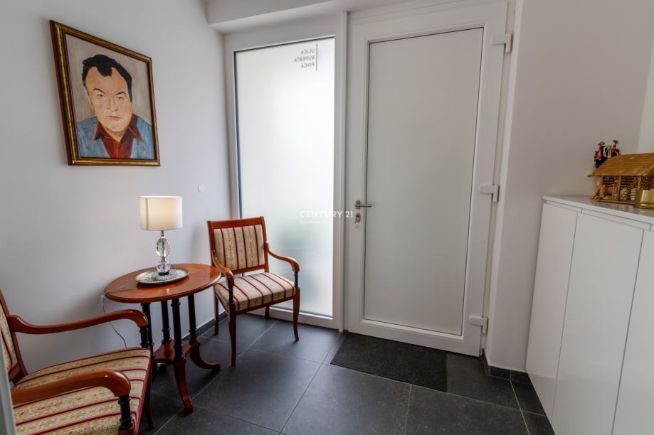 Zastekljena loža, ogrevana z IR paneli, nudi celoleten bivalni prostor. Povezana je z izolirano lopo, preurejeno v fitnes, ter z dostopom na urejen vrt, kjer ambient okrašujejo dekorativna drevesa. Tlakovana terasa in dovoz sta izvedena iz betonskih tlakovcev, vhodni podest v obliki rampe.