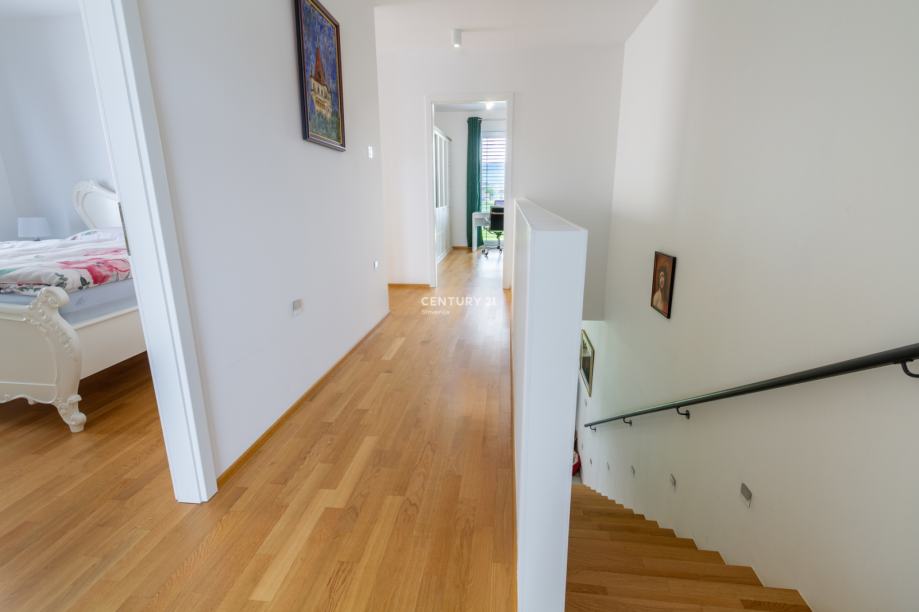 V zgornjem nadstropju se nahajajo kopalnica, glavna spalnica in dve otroški sobi. Stopnišče je obloženo s parketom in naravno osvetljeno.