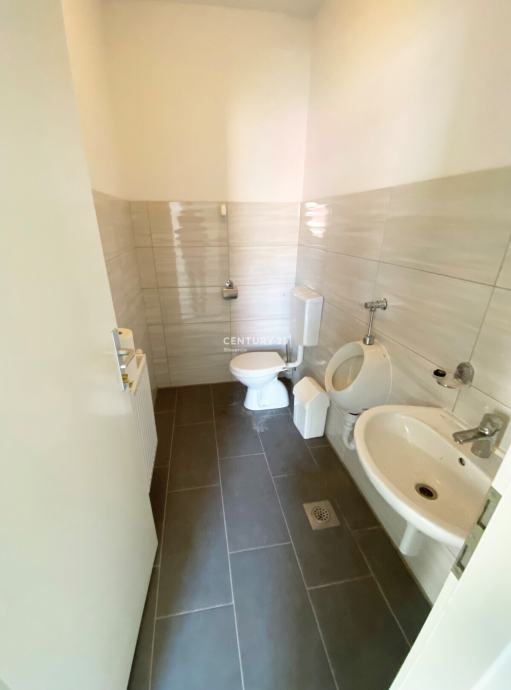 Iz skladišča je vhod v pomožne prostore 19 m2 (hodnik, garderoba, sanitarije in čajna kuhinja).