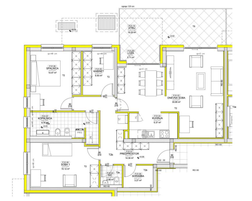 Svetila v stanovanjih niso predmet prodaje (stenski in stropni izpusti pripravljeni), svetila na balkonih montirana