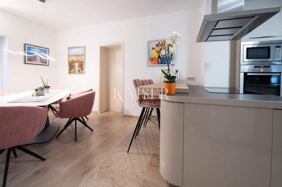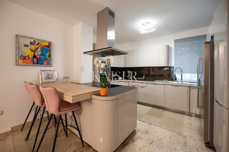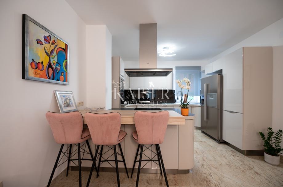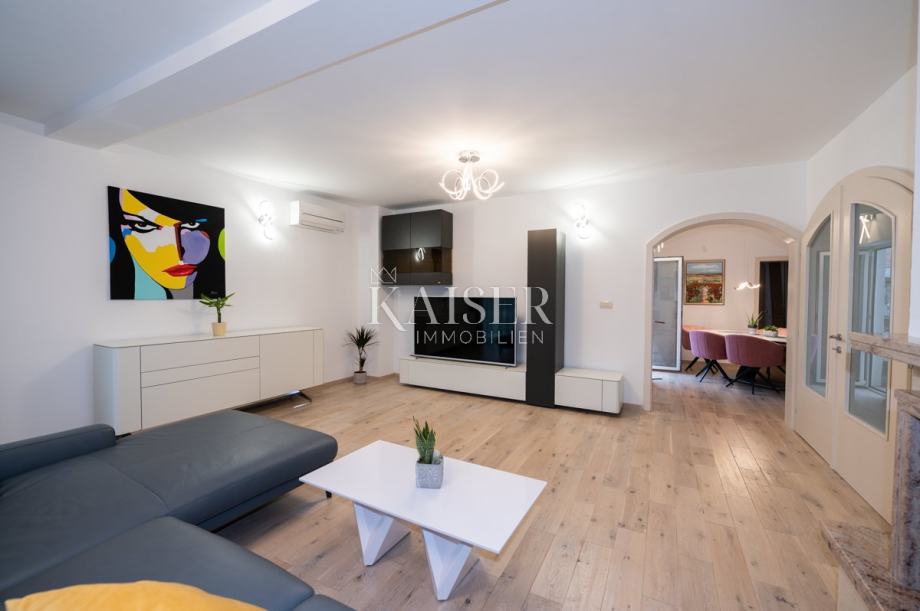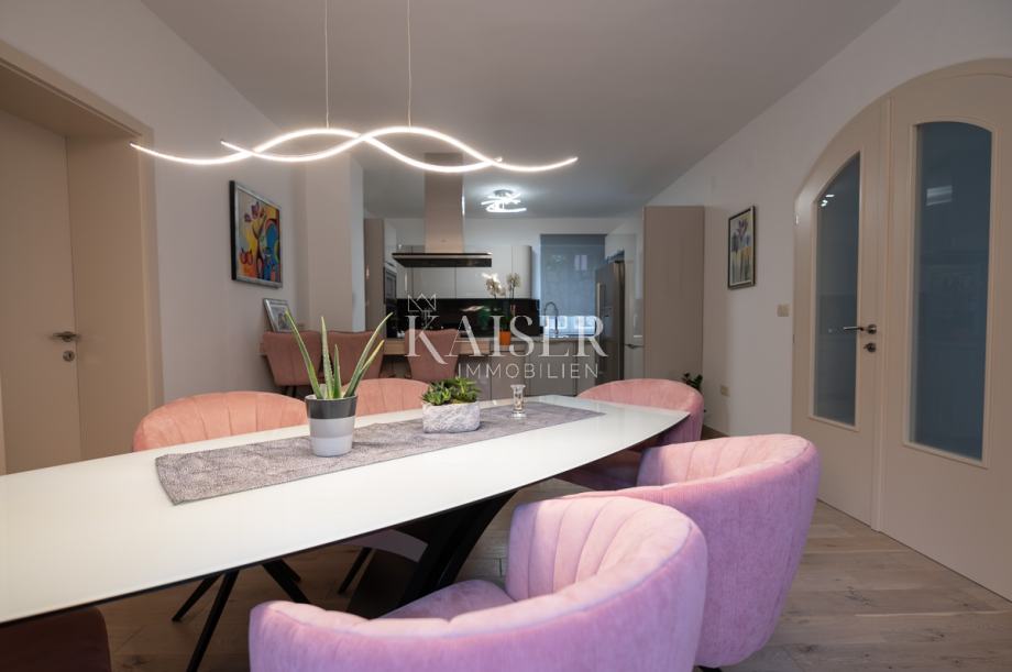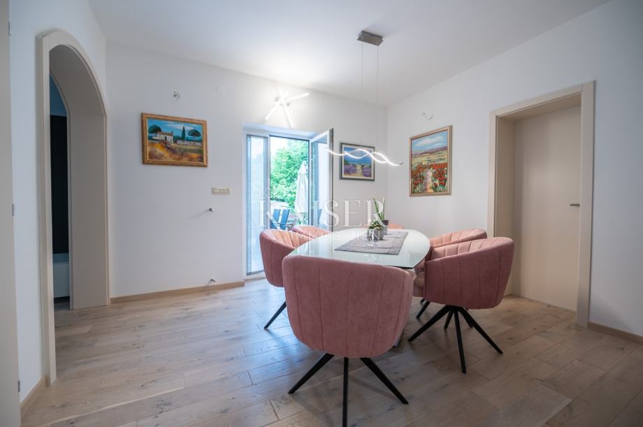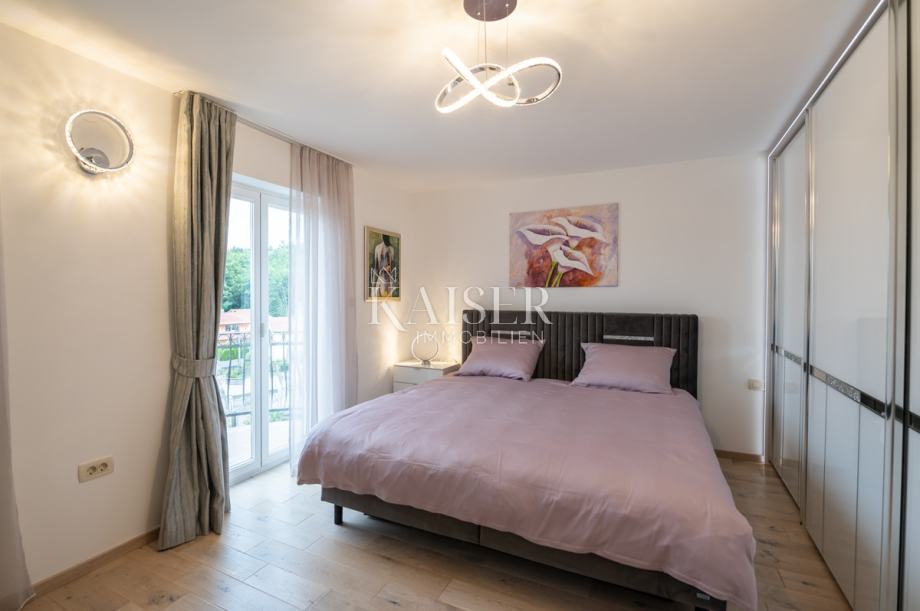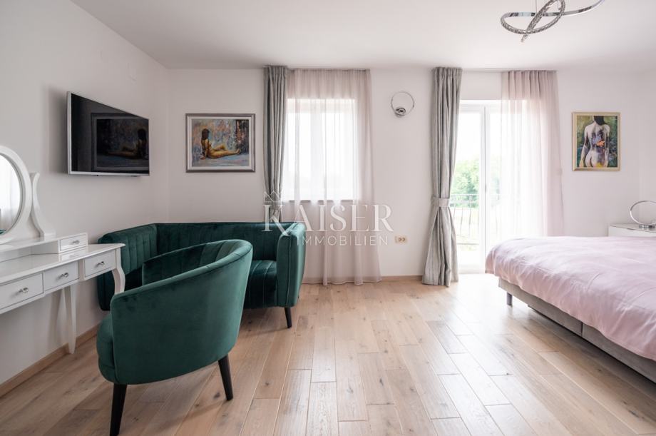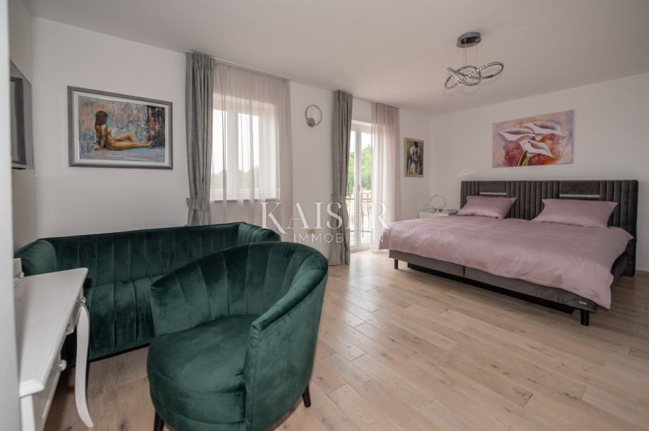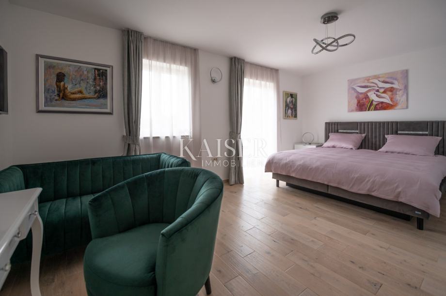 Kaiser Immobilien predstavlja to čudovito družinsko hišo z bazenom. Nahaja se na mirni, prijetni lokaciji, le 10 minut vožnje od centra Matulj in vseh potrebnih vsebin. Hiša s skupno površino 403 m² in odlično razporeditvijo prostorov je sestavljena iz več nadstropij. V kleti je velika garaža s shrambo. V prvem nadstropju se nahaja prostorna in svetla dnevna soba z izhodom na teraso ter kuhinja z jedilnico in izhodom na balkon. V srednji etaži sta dve spalnici, vsaka soba ima izhod na svoj balkon in svojo kopalnico. V zadnjem nadstropju se nahaja mansardno stanovanje, ki obsega dnevno sobo, kuhinjo in jedilnico v open space konceptu, z izhodom na balkon, dve kopalnici z WC in tuš kabino ter dve spalnici. Ob hiši je 525 m² velik vrt z bazenom, jacuzzijem, teraso z žarom in prostorom za druženje. Posebna pozornost je bila namenjena detajlom (kamin v dnevni sobi, svetila po hiši, umetniške poslikave, izbor materialov in barvne palete) ter izbiri kakovostnih materialov (parket, ploščice, pohištvo, kuhinja naprave itd.). Hiša se prodaja v celoti opremljena in urejena.