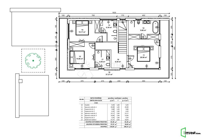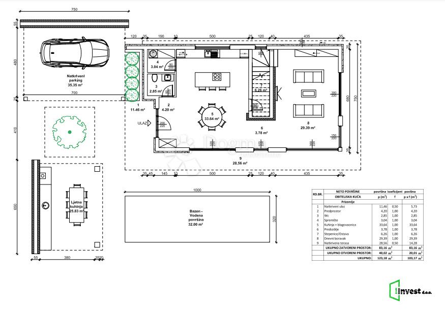 Hiši pripada tudi pokrito parkirno mesto velikosti 35,35 m².