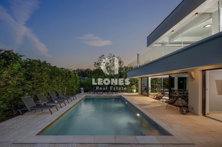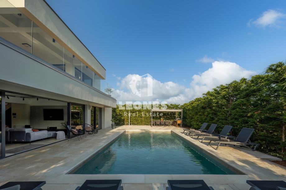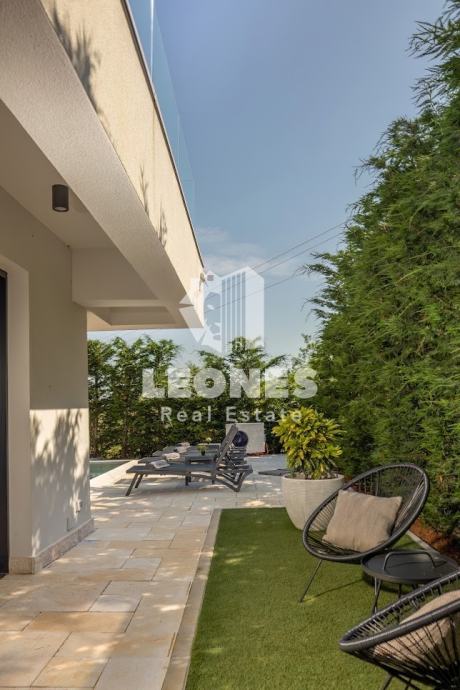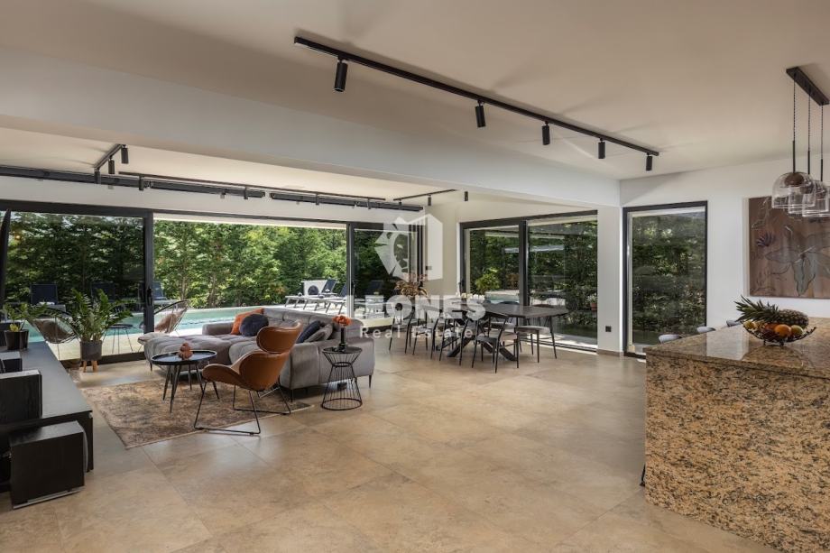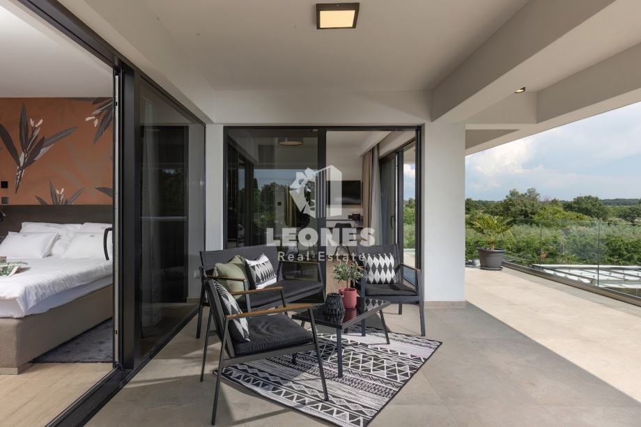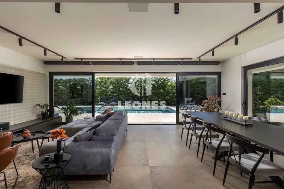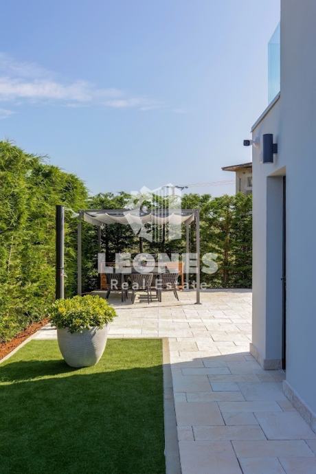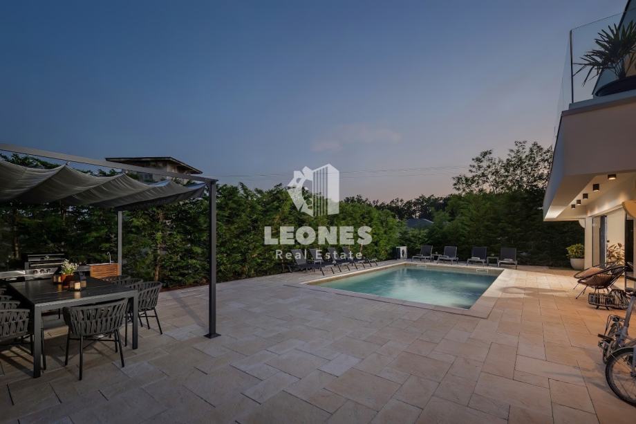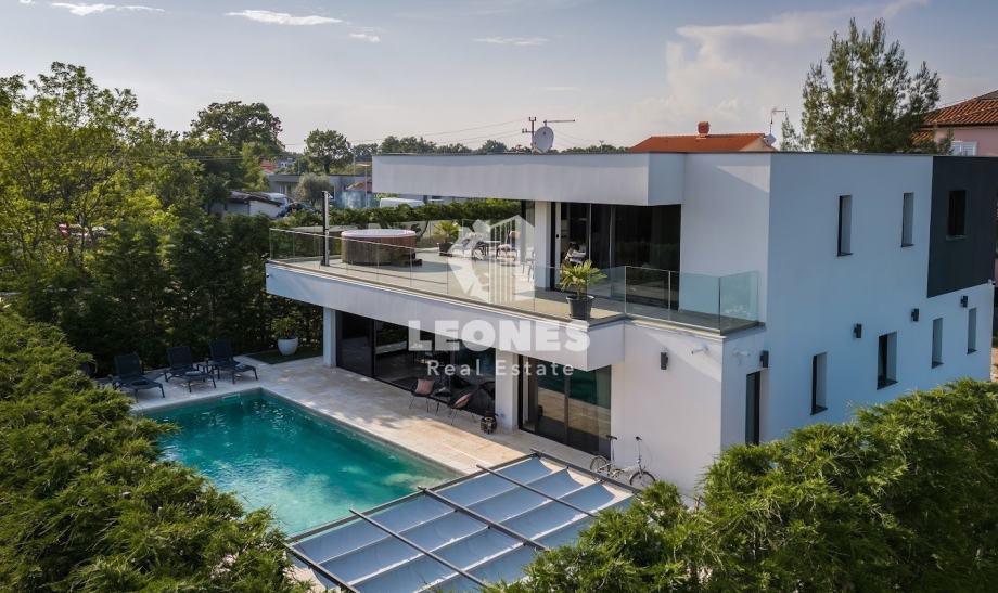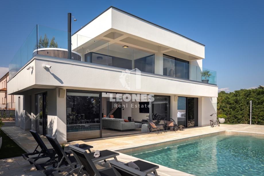 V bližini Umaga je naprodaj moderna vila z ogrevanim bazenom. Neto uporabna površina vile je 277,5 m2, površina zemljišča pa 756 m2. Vila se razprostira na dveh etažah. V pritličju je velik odprt prostor z dnevno sobo in kuhinjo ter izhodom na teraso, spalnico s kopalnico, savno in tehničnim prostorom. V prvem nadstropju so 3 spalnice, vsaka s svojo kopalnico. Dve spalnici imata izhod na veliko pokrito teraso z jacuzzijem.