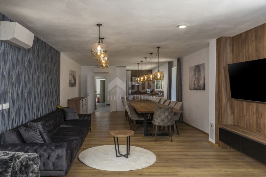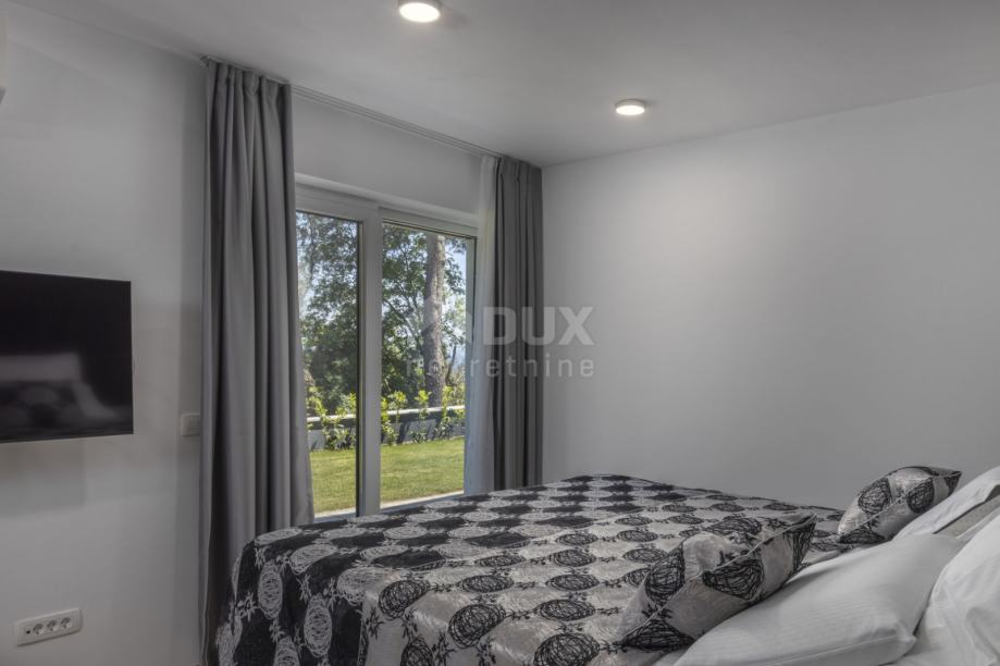 V neposredni bližini morja, obdana z zelenjem, se nahaja zasebna vila edinstvenega značaja na Opatijski rivieri. Ta sodoben primer gradnje je bil zgrajen na 1230m2 veliki parceli s pogledom na morje. Notranjost je letos opremljena z dizajnerskim pohištvom po meri. Hiša ima naslednjo razporeditev prostorov: PRITLIČJE: hodnik, spalnica z lastno kopalnico, WC in velik open space dnevni prostor s kuhinjo in jedilnico ter izhodom na teraso in ogrevan bazen PRVO NADSTROPJE: tri spalnice z lastno kopalnico , velik balkon južne orientacije, ki komunicira z eno spalnico KLET: dve spalnici s kopalnico, pisarna, wellness z jacuzzijem, savna, izhod na vrt. Koncept dnevne sobe odprtega prostora je pomemben del te čudovite hiše. Iz vseh južnih oken in steklenih sten je pogled na morje in zelenje Kvarnerja. Bazen velikosti 34m2 ima ogrevan sistem preko toplotne črpalke, sodobno LED razsvetljavo in kontra plavajočo črpalko. Hiša ima generalno alarmni sistem, video nadzor, vrt, asfaltirano parkirišče za 4 vozila. Vila je urejena po standardu kategorizacije 5 zvezdic, s posredovanjem te hiše pa je možno posvetovanje glede nadaljnjega oddajanja v bodoče (skrb celotnega objekta, upravljanje nepremičnine, najem nepremičnine). Ta nepremičnina je v lasti podjetja, cena pa je 2.000.000 € + DDV, če kupujete kot pravna oseba (z možnostjo oddaje zahtevka za vračilo DDV). Če hišo kupi kot fizična oseba, je cena z DDV 2.500.000€. Redkost na trgu, - popolno družinsko bivališče ali odlična naložba, ki jo lahko brezskrbno najamete preko upravitelja.