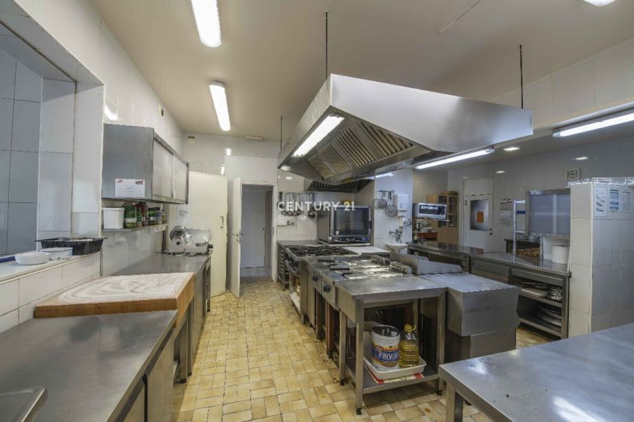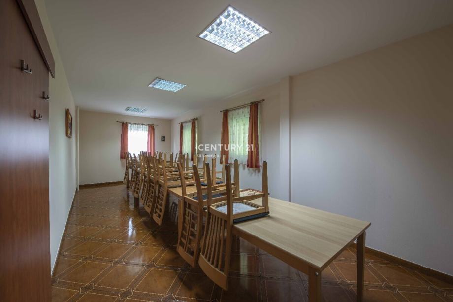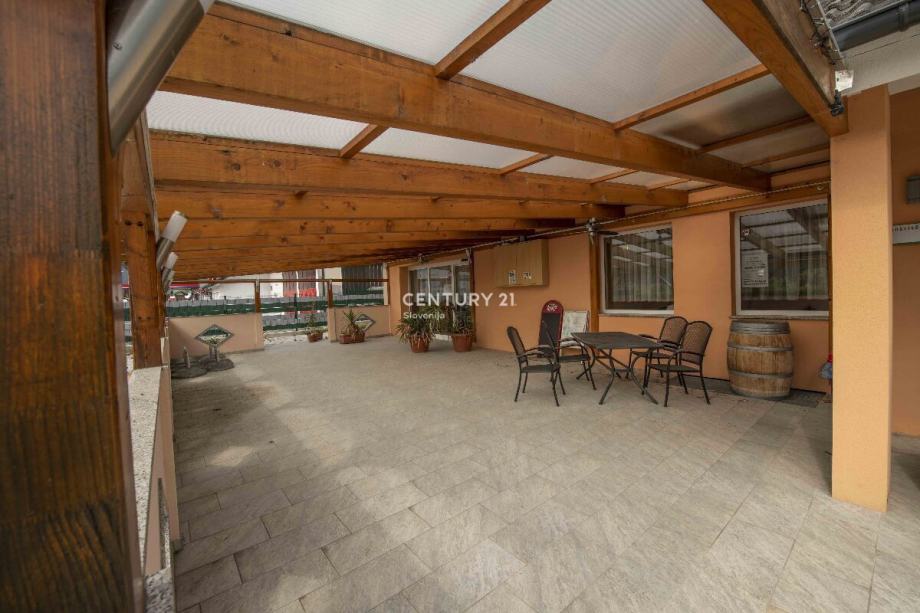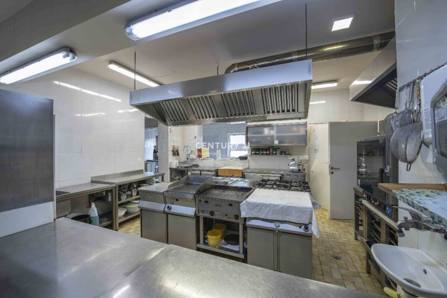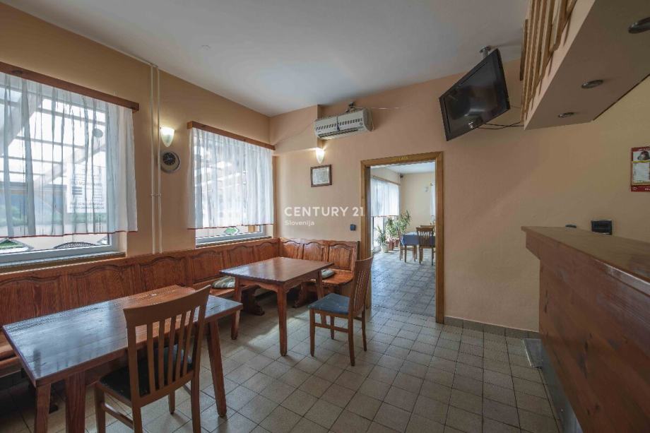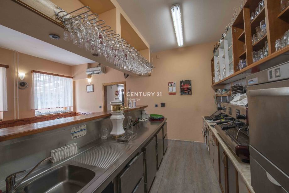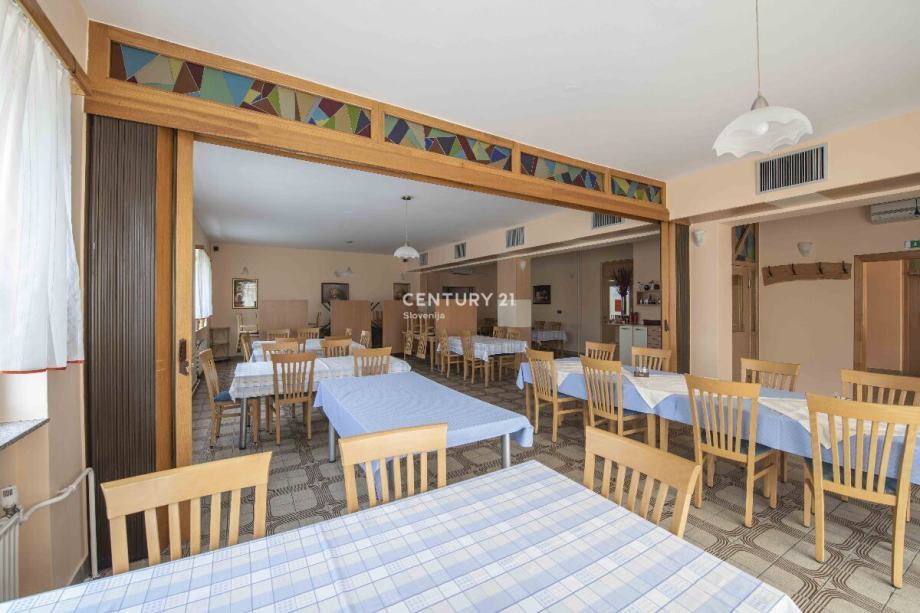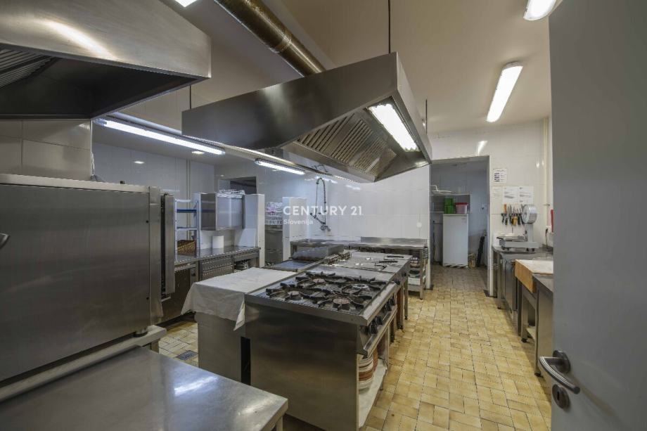 Gostinski objekt s skupno kvadraturo 535m2 zajema v pritljičju stavbe gostišče z točilnim pultom, veliko dvorano z izhodom na pokrito teraso, dodatno sobo za zaključene družbe, popolnoma opremljeno kuhinjo z novimi in modernimi aparati za pripravo hrane, ter ločene sanitarije namenjene obiskovalcem. Kuhinja ima lasten vhod, potreben za dostavo.