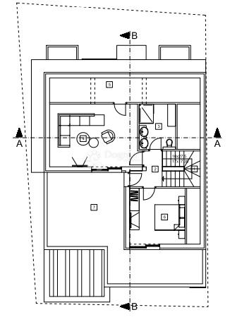 Dnevna soba vodi na pokrito teraso in vrt kjer se nahaja bazen in letna kuhinja za kvalitetno druženje in uživanje z družino.
