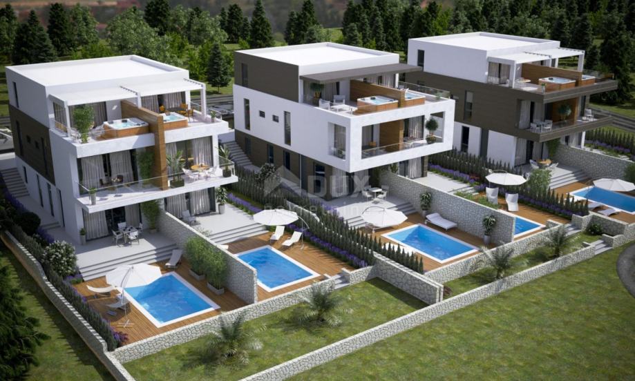 Na otoku Pagu v Novalji, le 200 metrov od morja, se nahajajo tri urbane vile s po 4 bivalne enote v vsaki. Dvosobna stanovanja v pritličju velikosti 62 in 69 m2 imajo vrt, bazen in eno parkirno mesto, dupleks stanovanja pa se nahajajo v prvem nadstropju in imajo jacuzzi na strešni terasi. Vrhunske novogradnje obdane z zelenjem na lepi lokaciji v bližini mesta in morja. Prodamo lepo stanovanje v pritličju urbane vile s 4 stanovanjskimi enotami. Stanovanje je sestavljeno iz dveh spalnic, dnevne sobe s kuhinjo, hodnika, kopalnice in pokrite terase. Ima vrt, bazen in parkirno mesto v posesti. Bivalna površina stanovanja je 69 m2, z vrtom, bazenom in parkirnim mestom pa je skupna površina 90 m2 (koeficienti). Novogradnja je zgrajena z vrhunskimi materiali in talnim gretjem v vseh prostorih, lokacija pa je blizu morja in plaže. V teku je dokončanje dveh objektov (pričetek vselitve do poletja). Tretjina je načrtovana do konca leta.