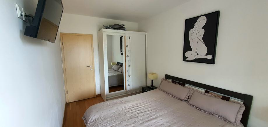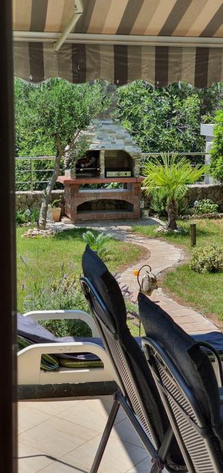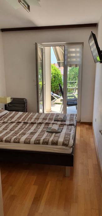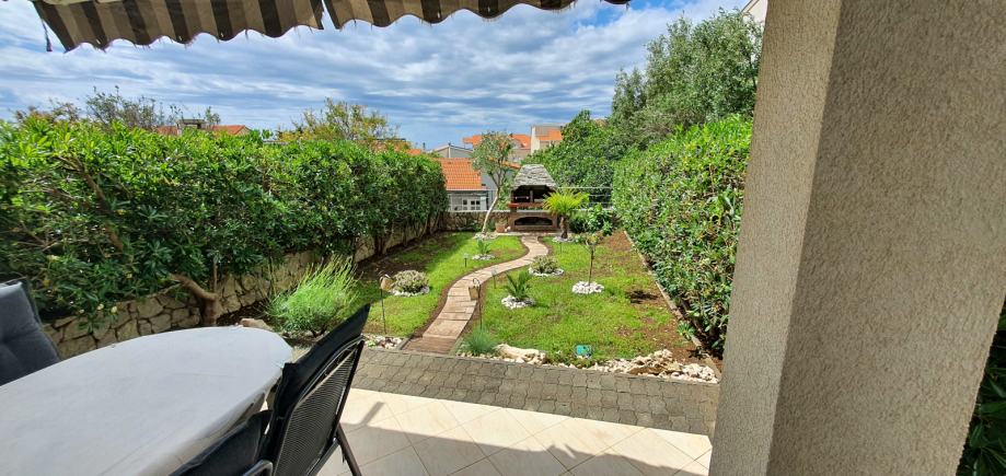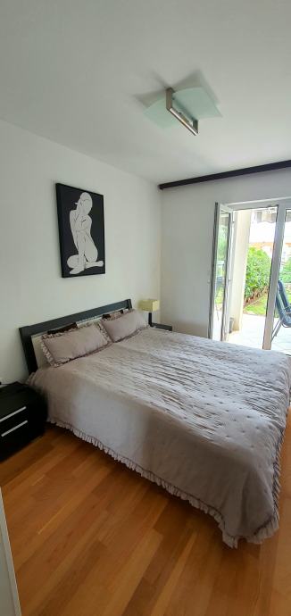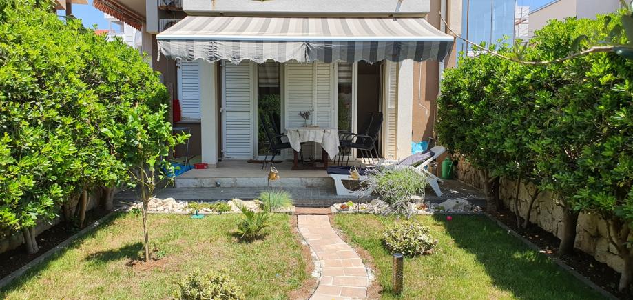 V pritličju prodamo popolnoma opremljeno 1,5 sobno stanovanje skupne površine 120 m2. Sestavlja ga hodnik, kopalnica z WC, spalnica, dnevna soba z kuhinjo in jedilnico skupne površine 37 m2, pokrita terasa s tendo površine 8,34 m2 in vrt površine 62 m2, ki nudi popolno zasebnost z ograjenim vrtom in lepo zasaditvijo namakalni sistemom ter žarom. Stanovanju pripada tudi parkirišče površine 12,50 m2.