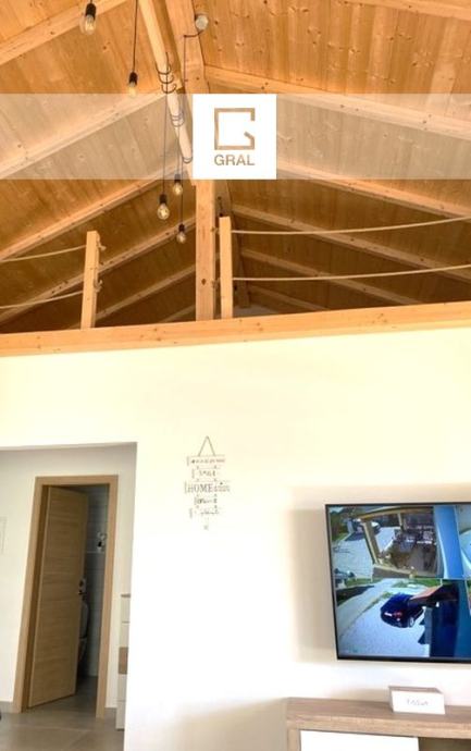 • ima dve etaži: v pritličju so dnevna soba, povezana s kuhinjo in jedilnico, z izhodom na 17 m2 veliko teraso ter spalnica in kopalnica. Prostor odlikuje več metrski strop, ki daje hiši občutek prostornosti.