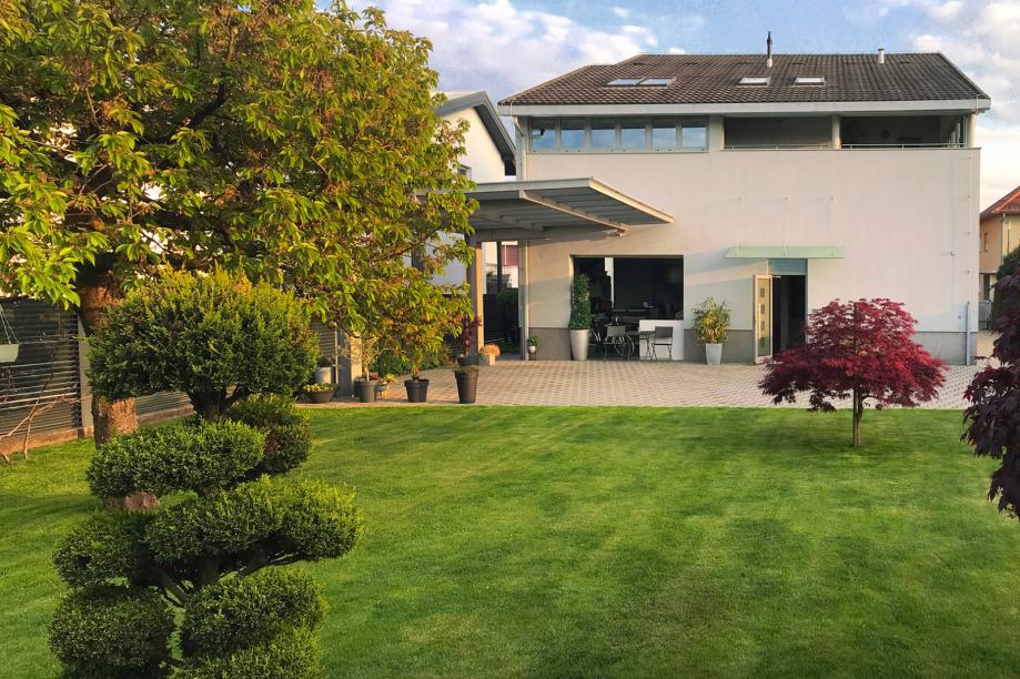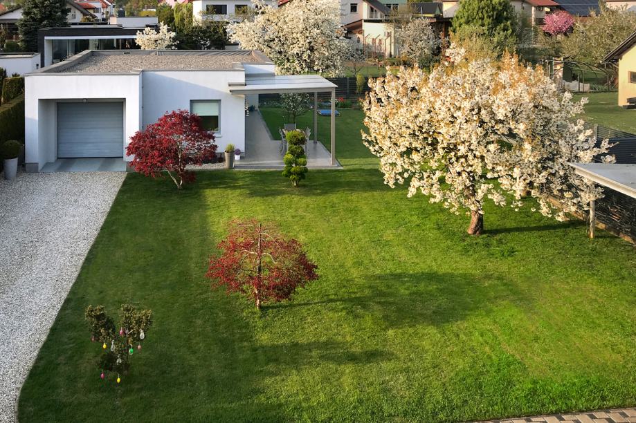 • Stavba 2 (110,4 m2): garaža za 2 avtomobila, shramba, kuhinja, velika pokrita letna terasa.