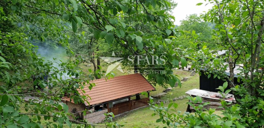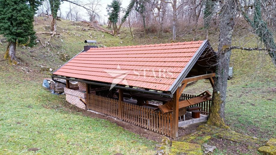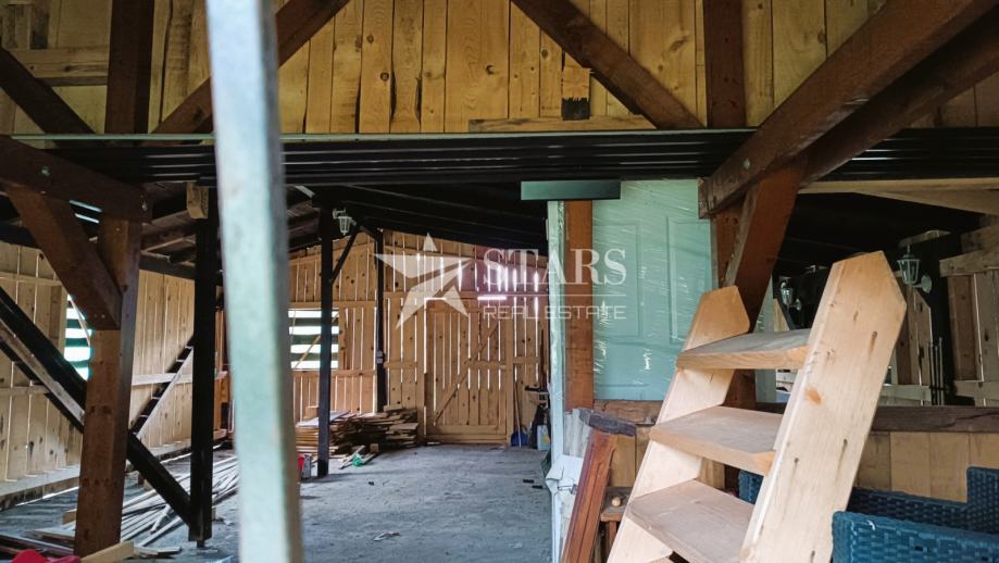 Na zemljišču se nahaja lesena hiša cca 130 m2, delno dokončana - postavljena je nova streha, notranjost pa je pripravljena za adaptacijo po vaših željah. Zasnovana je kot počitniška hiša z: