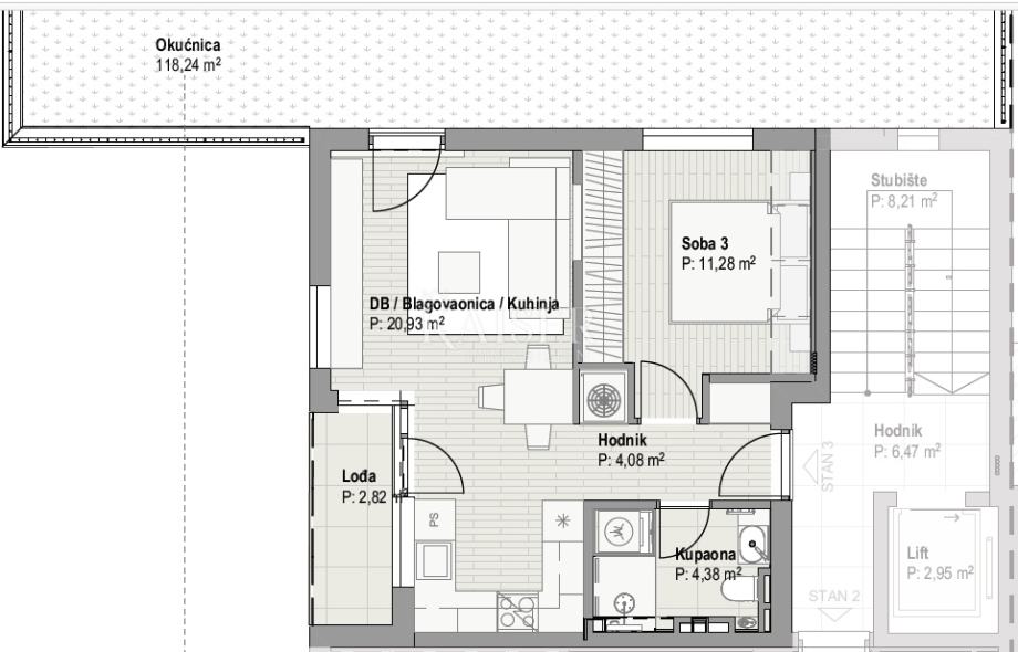 To enosobno stanovanje je po zaprti bivalni površini najmanjše od vseh štirih stanovanj v stavbi, po drugi strani pa ima največji vrt, velik 118 m2!