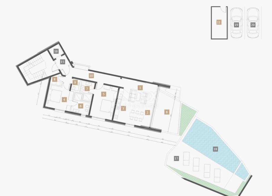 Ponujamo vam priložnost za uresničitev vaših sanj. Trud in znanje vrhunskih domačih arhitektov sta ponovno pokazala kakovosten rezultat. Posebna stavba s skupno 5 luksuznimi apartmaji se nahaja rahlo navkreber, 200 metrov zračne črte od centra Opatije. Ta arhitekturna mojstrovina se nahaja na zemljišču velikosti 1000 m2 v mirnem stanovanjskem območju, obdanem z zelenjem Opatije in ekskluzivnimi novogradnjami. Apartma 2, velikosti 96,68m2, se nahaja v pritličju stavbe in je sestavljen iz hodnika, dveh velikih spalnic, dveh kopalnic, WC-ja, pralnice, dnevne sobe s kuhinjo + jedilnico 34m2 in lastne terase 27m2 z dostopom do bazena stavbe in sončne terase. Stanovanje se prodaja kompletno, na ključ, vključno s kopalnico s sanitarijami, - pripravljeno za vgradnjo pohištva. Nekatere izmed pomembnih značilnosti tega objekta so: - visokokakovostno, odprto mizarstvo, steklene stene, ki zagotavljajo odprt pogled na morje in strehe zgodovinskih opatijskih vil - talno ogrevanje + toplotna črpalka - materiali blagovnih znamk in sanitarna keramika v kopalnicah - zunanji ogrevan bazen - podzemna garaža in 2 garažni mesti - dvigalo - integrirano hlajenje - energijsko učinkovita gradnja, trajnost Resnično fantastična naložbena priložnost v Opatiji - kombinacija brezčasne arhitekture, modernega luksuznega vzdušja in sodobne domače tehnologije. Zračna razdalja do morja oziroma promenade Lungomare je 450 metrov ali 4 minute hoje navzdol. Vožnja z avtomobilom ali motorjem traja le eno minuto. Predviden zaključek del oziroma vselitev objekta je konec leta 2024. Z zaupanjem se obrnite na agenta.