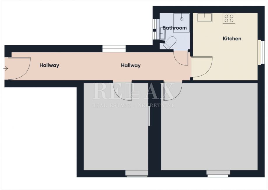 Tloris je odlično zasnovan — vhodni hodnik se razteza vzdolž celotnega stanovanja in vodi do kuhinje z jedilnim kotom. Na desni strani se nahajata dve prostorni sobi, ki se lahko prilagodita kot dve spalnici ali kot spalnica in dnevna soba, glede na potrebe. Na levi strani hodnika se nahaja kopalnica.