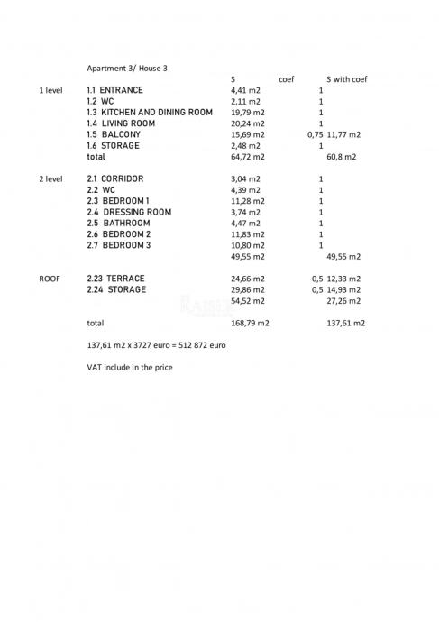 To trietažno stanovanje (H2A3) ima skupno površino 168,79 m2 (upoštevaje pripadajoče koeficiente 137,61 m2) in je sestavljeno iz 1. nadstropja, 2. nadstropja in mansarde s strešno teraso.