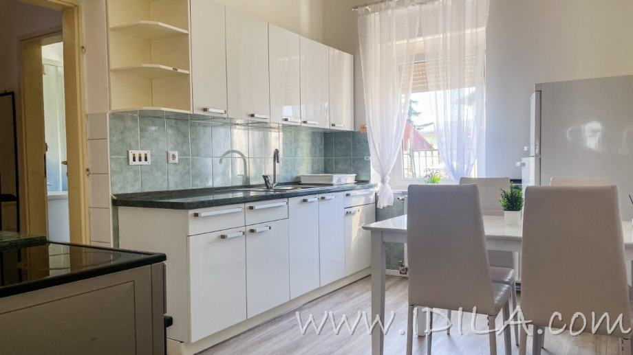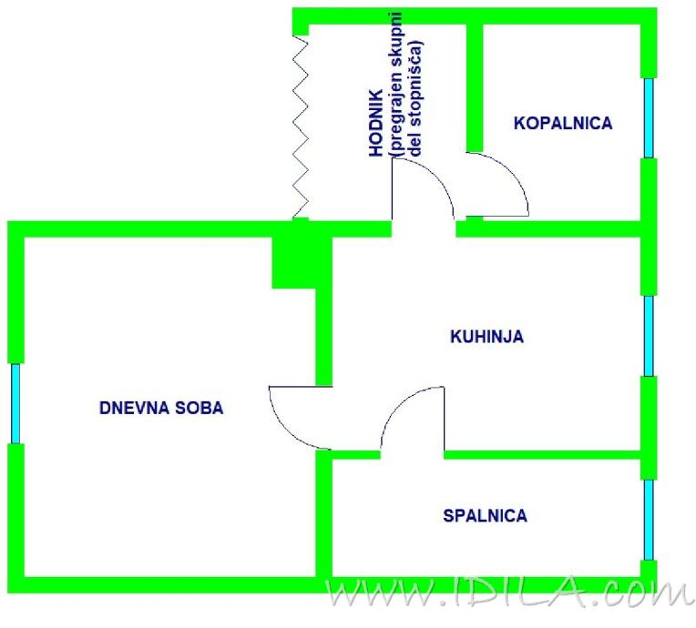 odkoder je dostop do kopalnice in do kuhinje. Iz kuhinje ja naprej vhod v dnevno sobo in manjšo spalnico (1,5 m