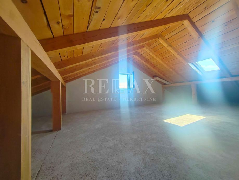 Stanovanjska površina hiše znaša 120 m² in obsega tri etaže – pritličje, nadstropje in visoko mansardo. Stanovanje v pritličju vključuje hodnik, dve spalnici, kopalnico, dnevno sobo s kuhinjo in prostorno teraso. V nadstropju je skoraj identična razporeditev: hodnik, dve spalnici, kopalnica, dnevna soba s kuhinjo, terasa in zunanje stopnišče, ki vodi do mansarde.
