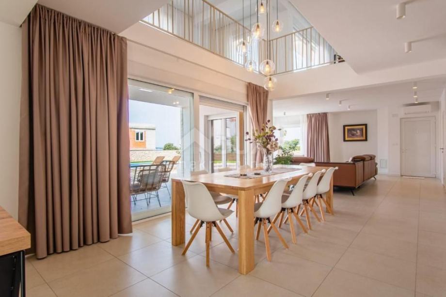 Prodamo to čudovito samostojno enonadstropno vilo na parceli 1124m2, ki se nahaja v mirnem okolju le 400 metrov od morja. Vila je razdeljena na dve etaži, kjer se v pritličju nahaja velika dnevna soba s kuhinjo in jedilnico, dve spalnici in dve kopalnici. V prvem nadstropju vile imamo tri spalnice, od katerih ima vsaka svojo kopalnico, nato odprt prostor, kjer imamo biljard, fitnes, savno in dva balkona. Na lepem ograjenem dvorišču imamo ogrevan bazen velikosti 32 m2, prostor za sončenje in paviljon z žarom za prijetna poletna druženja. Vila je v celoti opremljena z modernim in luksuznim pohištvom, kjer je bilo poskrbljeno za vsako podrobnost, talnim gretjem po vsej vili in v celoti klimatizirana in se kot taka prodaja. Luksuzna nepremičnina vredna pozornosti.