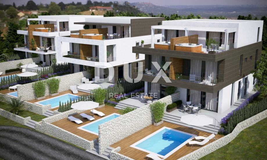 Na otoku Pag v Novalji, le 200 metrov od morja, se nahajajo tri urbane vile s 4 stanovanjskimi enotami. Dvosobna stanovanja v pritličju velikosti 62 in 69 m2 imata vrt, bazen in eno parkirno mesto, medtem ko se dvonadstropna stanovanja nahajajo v prvem nadstropju in imajo jacuzzi na strešni terasi. Vrhunske novogradnje, obdane z zelenjem, na čudoviti lokaciji v bližini mesta in morja.