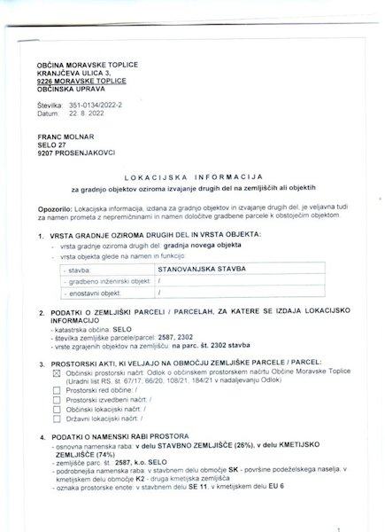 V kraju Selo, ki se nahaja v občini Moravske Toplice in v Krajinskem parku Goričko, prodamo zemljišče velikosti 2.805 m2, parcelna številka 2587 katastrska občina SELO. Zemljišče leži na položnem terenu kraja, ki se razprostira po planoti goričkega peščenjaka. Ima obliko trikotnika, in na njegovem severnem robu meji na sosednja kmetijska zemljišča z gozdovi, na zahodnem robu na gradbeno zemljišče, na južnem robu pa na asfaltirano lokalno cesto. Stavbni del zemljišča zajema 26%, to je približno 720 m2, ostali del zemljišča je opredeljeno kot kmetijsko zemljišče. Parcela ravna in sončna. Na podlagi javno dostopnih podatkov poteka po predmetnem zemljišču vodovodno in električno omrežje javne oz. zasebne gospodarske infrastrukture. Po lokacijski informaciji za gradnjo objektov ..., spada stavbni del predmetnega zemljišča v delu območja SK - površine podeželske naselja. Tam so možni posegi za stanovanjske stavbe s pomožnimi objekti, ne stanovanjske stavbe s pomožnimi objekti, gradbeni inženirski objekti... Parcela je urejena, mejnikov nismo zaznali. Zemljiška knjiga izkazuje zastavno pravico in prepoved odtujitve in obremenitve nepremičnine. Oseba, ki uveljavlja prepoved in obremenitve nepremičnine, se strinja s prodajo. Trenutno stanje dolga znaša okoli 12.000€ na september 2022. Videno-kupljeno. Do Moravskih Toplic traja vožnja 10 min. Do Murske Sobote oziroma do avtocestnega priključka vožnja traja 15 minut. Ker je del zemljišča opredeljen kot kmetijsko zemljišče je potrebno celotno zemljišče, ob dogovoru s kupcem o nakupu, najprej ponuditi predkupnim upravičencem v odkup. Ponudba stoji na pristojni UE 15 dni in če se nihče od predkupnih upravičencev na ponudbo o odkupu ne prijavi, ovir za nakup posesti za zainteresirano stranko ni. Istočasno se mora ponuditi v odkup državi Sloveniji po zakonu o krajinskem parku. Ta po navadi ne uveljavlja predkupne pravice in že v desetih dneh po predstavljeni ponudbi odgovori s pismom o nezainteresiranosti. Prodajalec se zavezuje plačati stroške nepremičninske agencije ter vseh davkov. Celoten strošek prepisa pri izbranem odvetniku ali notarju v celoti plača kupec. Za dodatna vprašanja oz. ogled vas prosimo, da se obrnete na navedenega nepremičninskega agenta.