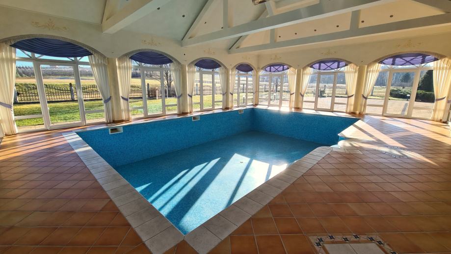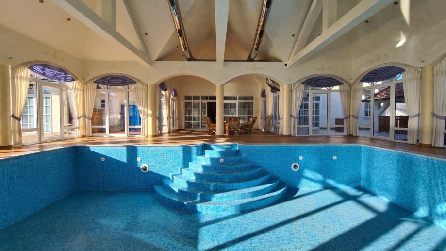 Pritlični del dopolnjuje prostorni notranji bazen, ki vam s svojo velikostjo omogoča plavanje in brezskrbno igro z vašimi otroki in druženje s prijatelji. Ob tem pa je tudi Spa prostor s savno. Bazenski del je svetel saj vas z zunanjostjo ločijo steklene panoramske stene, bazen je velikosti 6m x 10m in globine 1,5m.