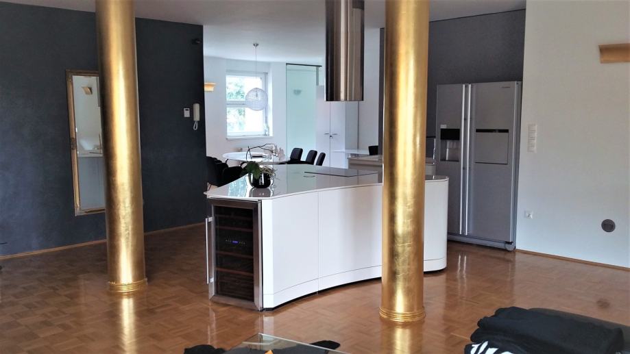 Zajema velik bivalen prostor (kuhinjo z jedilnico in dnevno sobo) z izhodom na večji balkon, dve spalnici, veliko kopalnico z wc-jem, v kateri sta kad in tuš ter še en, ločen wc. Je v velikosti 155 m2, od tega 18 m2 balkona in kletna shramba.