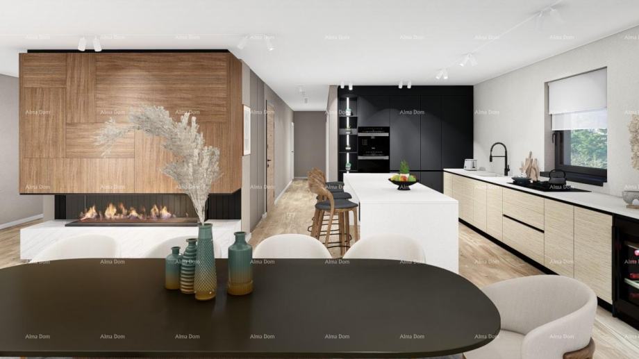 Penthouse je sestavljen iz velike dnevne sobe 68 m2, 5 spalnic; vsaka spalnica ima svojo kopalnico. Čudovita pokrita terasa 29 m2 z božanskim 180-stopinjskim odprtim pogledom na morje in 1400 let staro mesto Poreč. Velika strešna terasa s 188 m2 daje občutek moči in moči, saj se nahaja nad vsemi drugimi hišami in ima neoviran in odprt 180-stopinjski pogled na morje in staro mestno jedro. Na tej strešni terasi so pustili priključke, da se lahko namesti letna kuhinja, tuš in jacuzzi. Penthouse je pravzaprav kot hiša za nekoga, ki se mu ne ljubi ukvarjati z vrtom in ne želi imeti stroškov vzdrževanja, zalivanja in košnje trave. Visoka kakovost gradnje in razpoložljivost vseh objektov; nakupovalne, kulturne, izobraževalne in rekreacijske vsebine, potrebne za kakovostno družinsko življenje, so elementi, ki krasijo ta penthouse v tem urbanem objektu s samo 5 stanovanji. Ko pridete v garažo z avtomobilom, se lahko z dvigalom popeljete do penthousea. Lastnik penthousea ima ključ za dvigalo do penthousea in ga lahko samo uporablja; drugi najemniki ne morejo. Penthouse se prodaja neopremljen, edino kar je opremljeno so kopalnice.