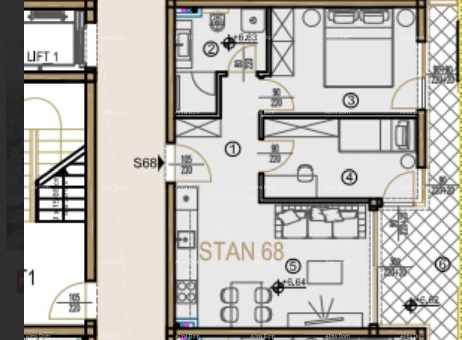 Stanovanje S68 se nahaja v drugem nadstropju in obsega hodnik z garderobo, kopalnico, 2 spalnici, dnevno sobo s kuhinjo in jedilnico ter loggio.