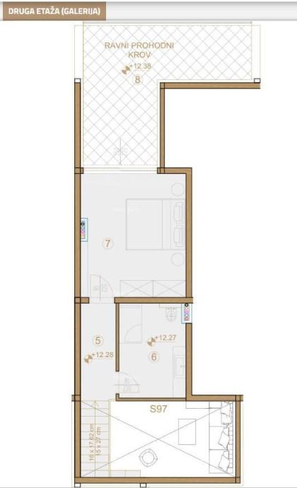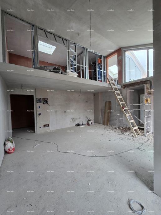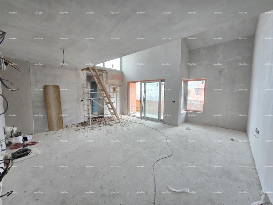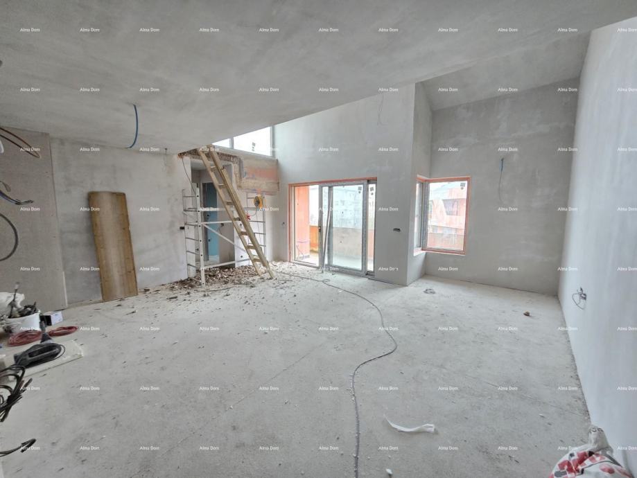 Dvonadstropni Penthouse se nahaja v 3. nadstropju stavbe v PREMIUM MODRI CONI z galerijo in pogledom na morje in mesto Poreč. Sestoji iz dnevne sobe s kuhinjo in jedilnico, treh spalnic, dveh kopalnic, lože in strešne terase v sklopu galerije.