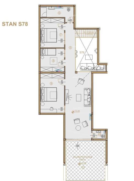 Dvonadstropni Penthouse se nahaja v 3. nadstropju stavbe v PREMIUM MODRI CONI z galerijo in pogledom na morje in mesto Poreč. Obsega dnevno sobo s kuhinjo in jedilnico, štiri spalnice, dve kopalnici, ložo in strešno teraso v sklopu galerije.