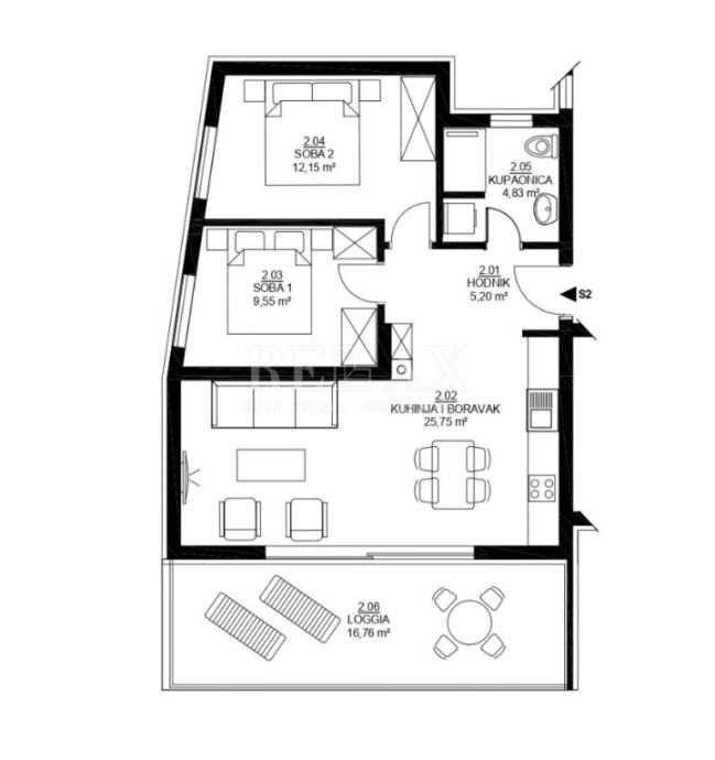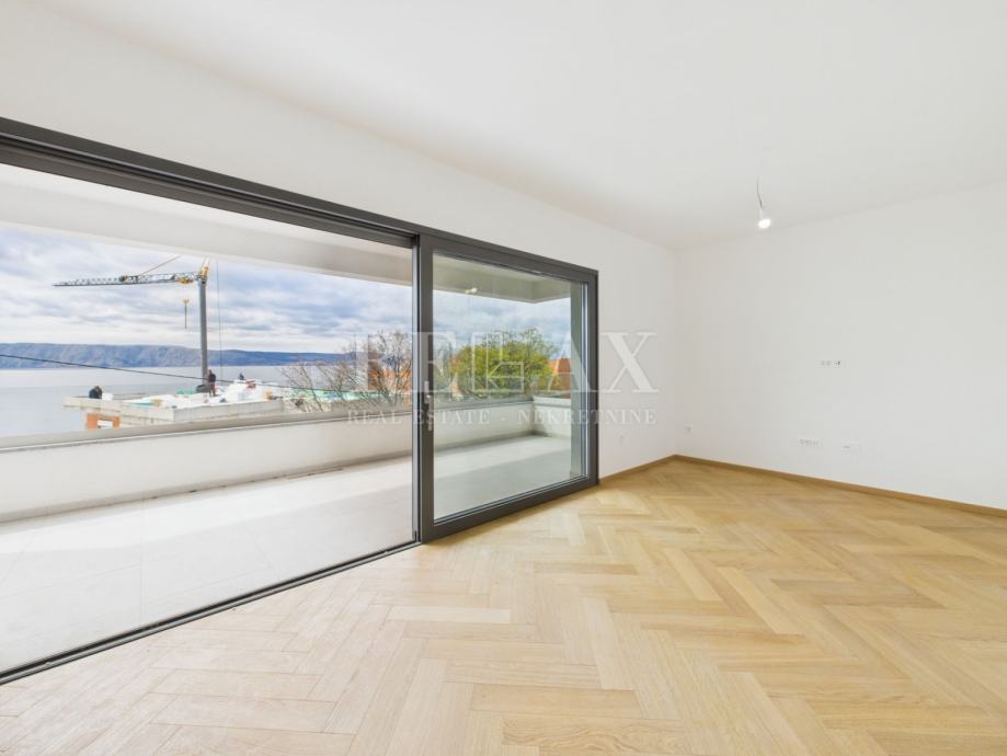 Stanovanje obsega prostorno dnevno sobo s kuhinjo in jedilnico, dve spalnici ter kopalnico. Velike steklene stene povezujejo dnevni prostor s prostorno pokrito teraso, ki nudi čudovit panoramski pogled na morje – popoln kraj za uživanje v poletnih dneh in večerih.