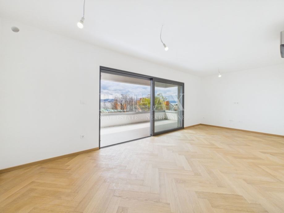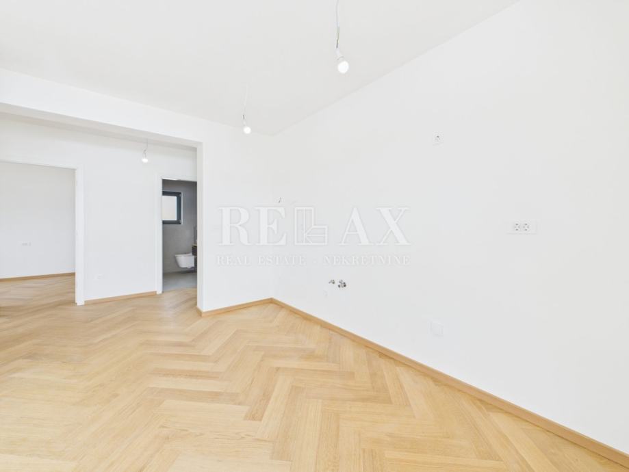 Notranjost je zasnovana z poudarkom na kakovosti in estetiki – tla so obložena s parketom v vzorcu ribje kosti, kopalnica in terasa pa s protizdrsnimi keramičnimi ploščicami. Aluminijasto zunanje stavbno pohištvo z roletami, bela lakirana notranja vrata, protivlomna vhodna vrata in videodomofon z možnostjo daljinskega odklepanja dodatno poudarjajo varnost in funkcionalnost stanovanja.