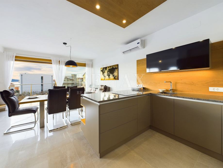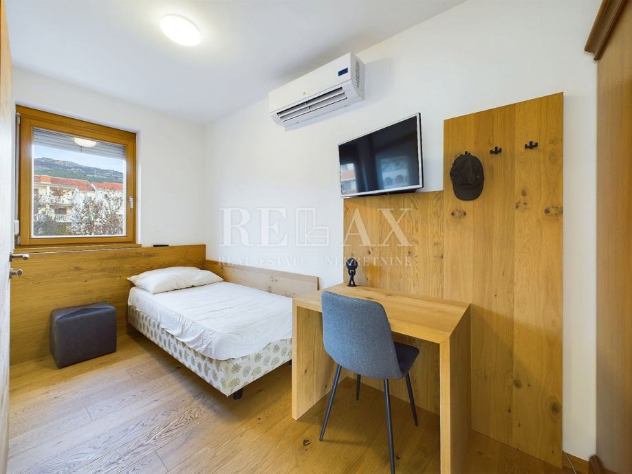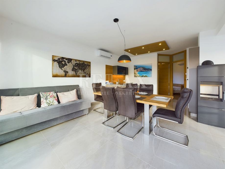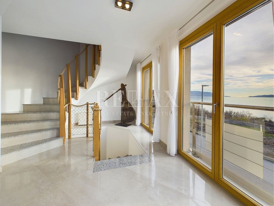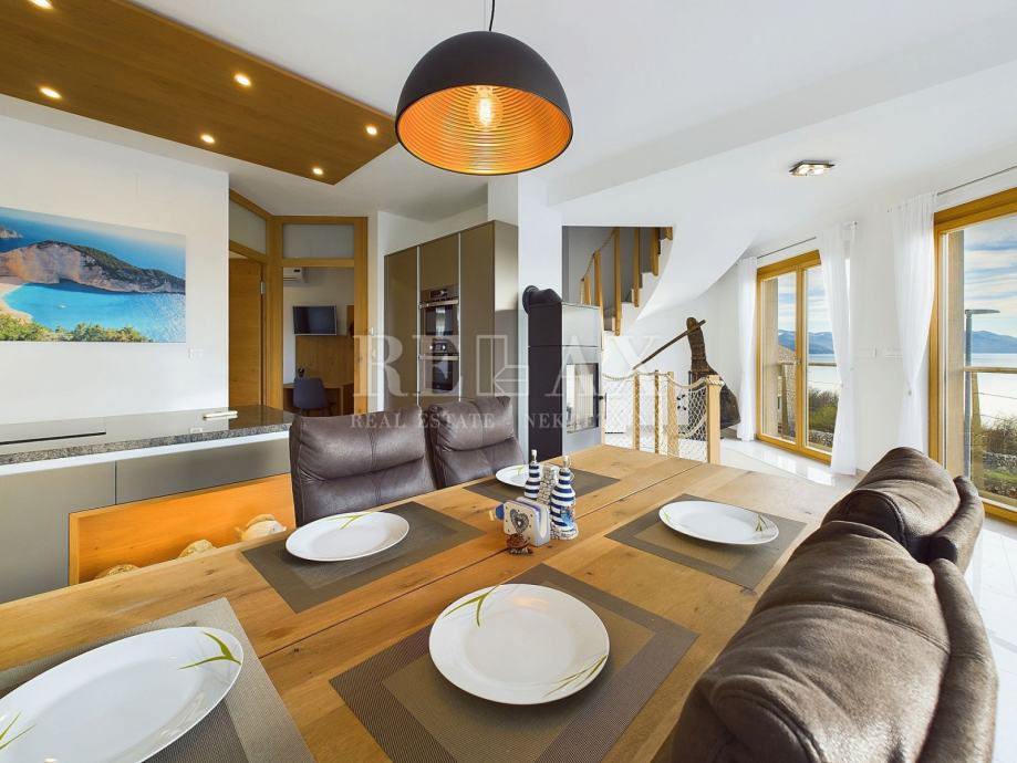 Hiša je razporejena na tri etaže. V pritličju se nahajajo garaža, vhodna avla in stopnišče. Prvo nadstropje zajema prostorno kuhinjo z jedilnico in dnevno sobo, eno spalnico, kopalnico ter balkon, ki nudi sproščujoč pogled na morje. V drugem nadstropju sta dve spalnici, kopalnica in še en balkon s panoramskim pogledom na Jadransko morje.
