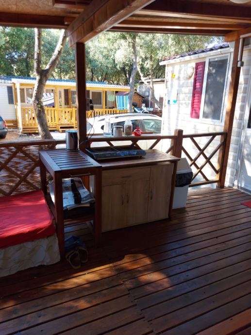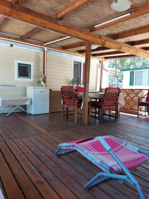 Naprodaj lepo ohranjena mobilna hiška Sunroller velikosti 8 m × 3 m z dodatno pokrito leseno teraso (8 m × 5 m).