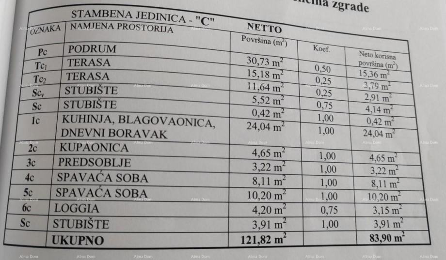 Stan ima 83,90 m² bivalne površine in je razporejen v dveh etažah. V pritličju se nahaja svetel dnevni prostor, povezan s kuhinjo in jedilnico, urejen v modernem in toplem slogu, ter kopalnica. Prostor je praktično organiziran in prijeten za bivanje. V nadstropju sta dve spalnici ter loža, idealna za jutranjo kavo ali sprostitev.