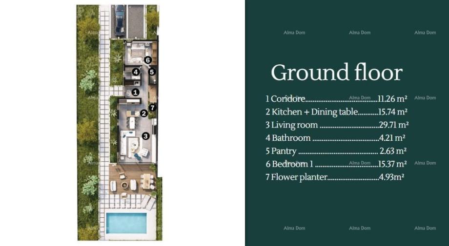 Vila B19, skupne površine 211,95 m2, je sestavljena iz pritličja in prvega nadstropja. V pritličju je hodnik, dnevna soba, kuhinja z jedilnico, kopalnica, spalnica, shramba in zelenica za rože.