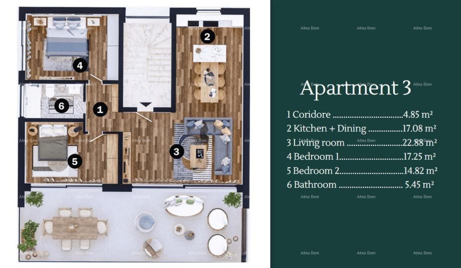 Apartma 3/D8, skupne površine 124,87 m2 (82,33 m2 apartma + 42,64 m2 pokrita terasa) se nahaja v 1. nadstropju stavbe z skupno 4 apartmaji. Apartma sestavljajo hodnik, dnevna soba, kuhinja s jedilnico, 2 spalnici, kopalnica in pokrita terasa. Apartmaju pripadata 2 parkirni mesti.