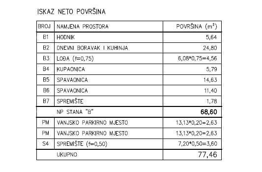 Stan D-B se nahaja v prvem nadstropju zgradbe D in obsega skupno površino 77,45 m², vključno s stanovanjskim delom, ložo, dvema parkirnima mestoma in shrambo.