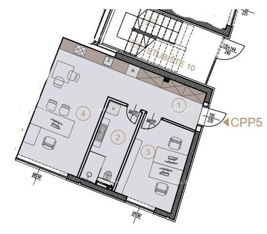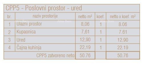 Poslovni prostor CPP5 se nahaja v pritličju osrednje enote stavbe in obsega: vhodni prostor, čajno kuhinjo, kopalnico in pisarno.