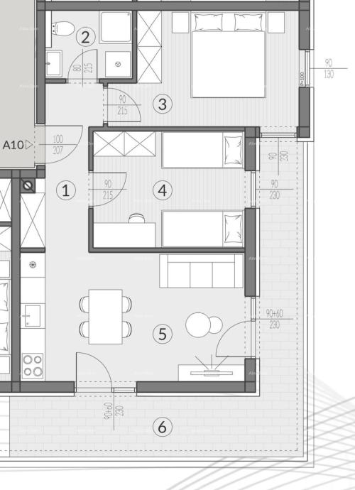 Stan A10 se nahaja v 1. nadstropju stavbe in obsega: hodnik + garderoba, dnevna soba s kuhinjo in jedilnico, 2 spalnici, kopalnico in pokrito teraso. Stanovanju pripada eno parkirno mesto PM3 velikosti 3,12 m2.