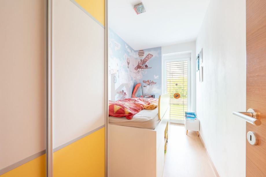 77 m² lastniškega atrija z neposrednim izhodom iz dnevne sobe in vseh treh spalnic – travnata površina, terasa za sproščene večere, prostor za žar in otroške igraje, ki daje pristen občutek hišnega bivanja na enem nivoju.