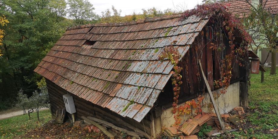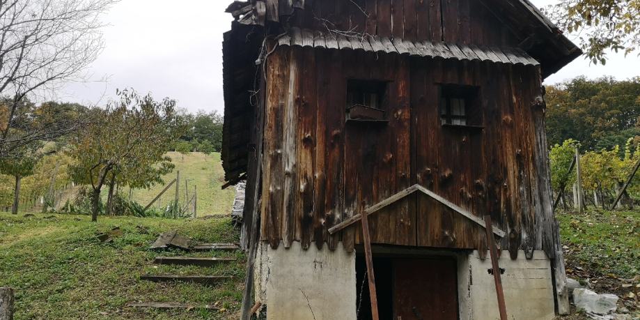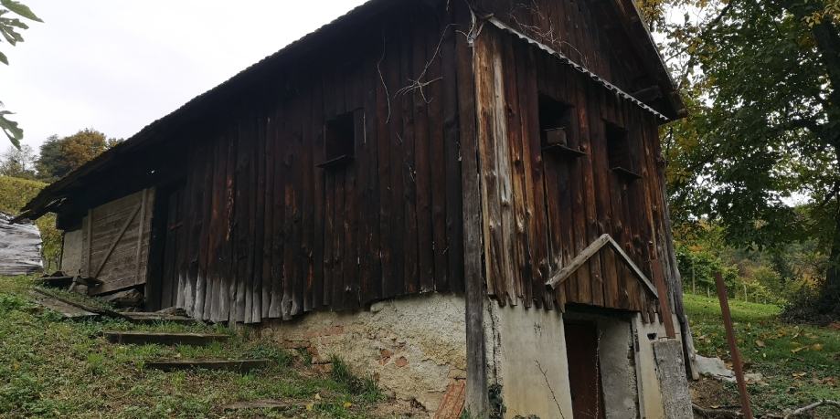 Na zazidljivem zemljišču stoji hiša v izmeri 45m2. Hiša ima betonsko ploščo pod katero je klet, preostali del hiše pa je lesen.