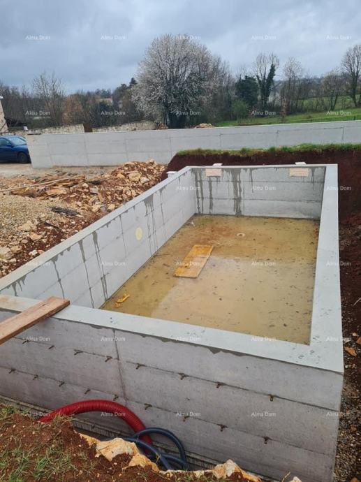 Hiša v izgradnji v osrednji Istri, Pazin, na parceli 800 m2 prodamo. Pritličje z bazenom 155 m2, elektrika in voda na parceli.