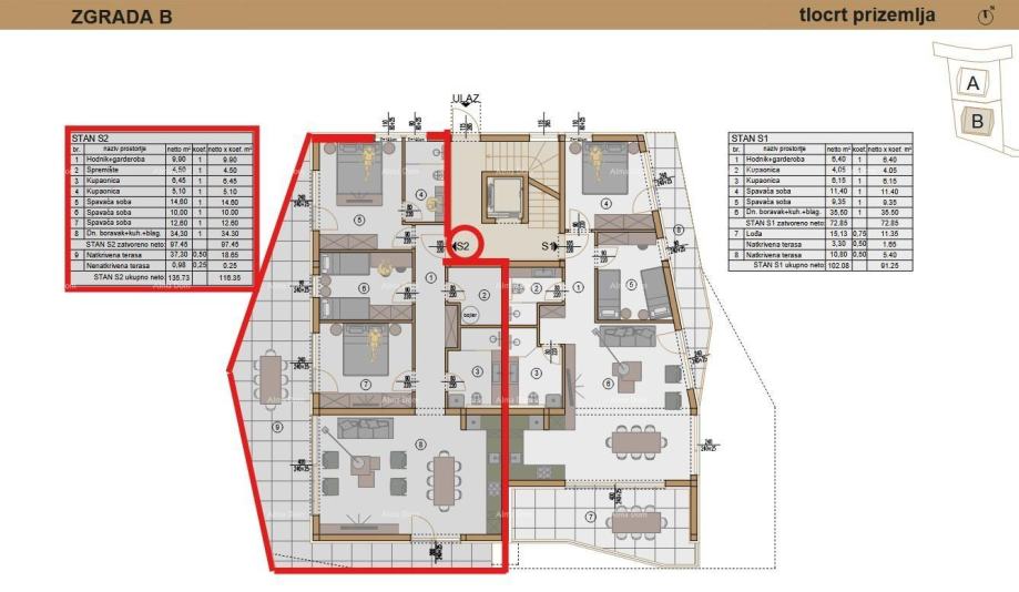 Stanovanje S2 se nahaja v pritličju stavbe B, s skupno površino 135,73 m² (neto površina 116,35 m²). Sestoji iz predsobe z garderobo, shrambe, 3 spalnic, 2 kopalnic, dnevne sobe s kuhinjo in jedilnico ter prostorne pokrite terase, do katere je dostop iz vseh sob, s čudovitim pogledom na morje.